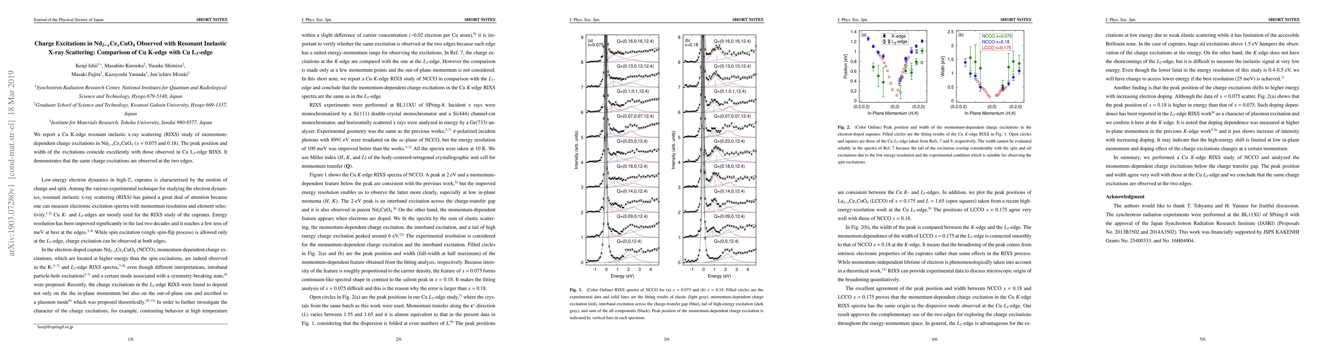 We report a Cu K-edge resonant inelastic x-ray scattering (RIXS) study of momentum-dependent charge excitations in Nd$_{2-x}$Ce$_x$CuO$_4$ ($x$ = 0.075 and 0.18). The peak position and width of the excitations coincide excellently with those observed in Cu L$_3$-edge RIXS. It demonstrates that the same charge excitations are observed at the two edges.