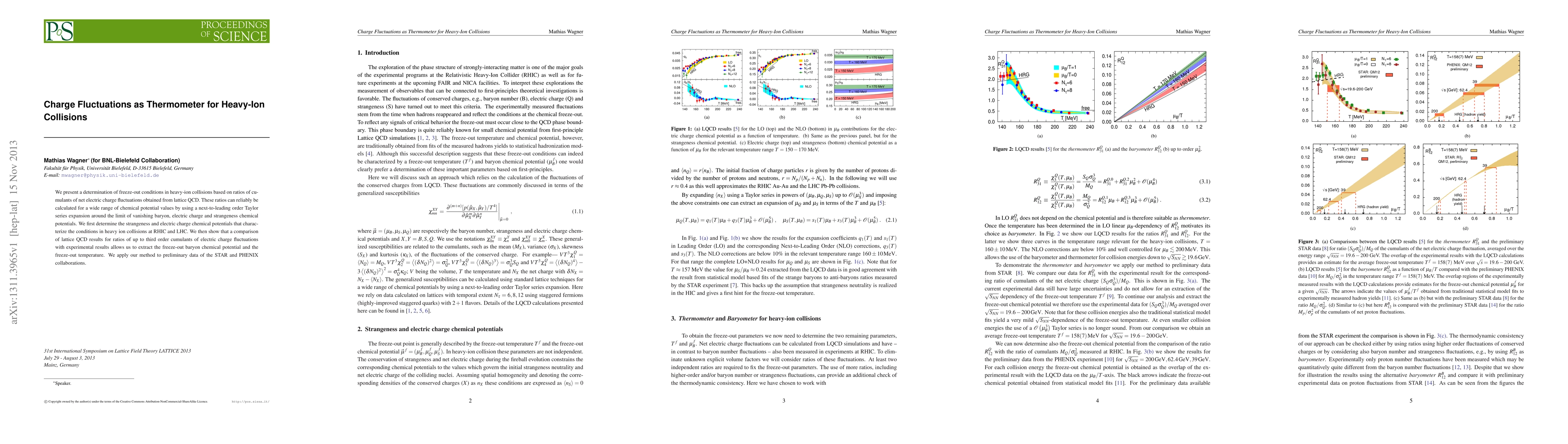 This paper uses lattice QCD to determine freeze-out conditions in heavy-ion collisions by analyzing ratios of cumulants of net electric charge fluctuations. The method reveals the strangeness and electric charge chemical potentials, and compares theoretical results with experimental data from STAR and PHENIX to extract the freeze-out baryon chemical potential and temperature.