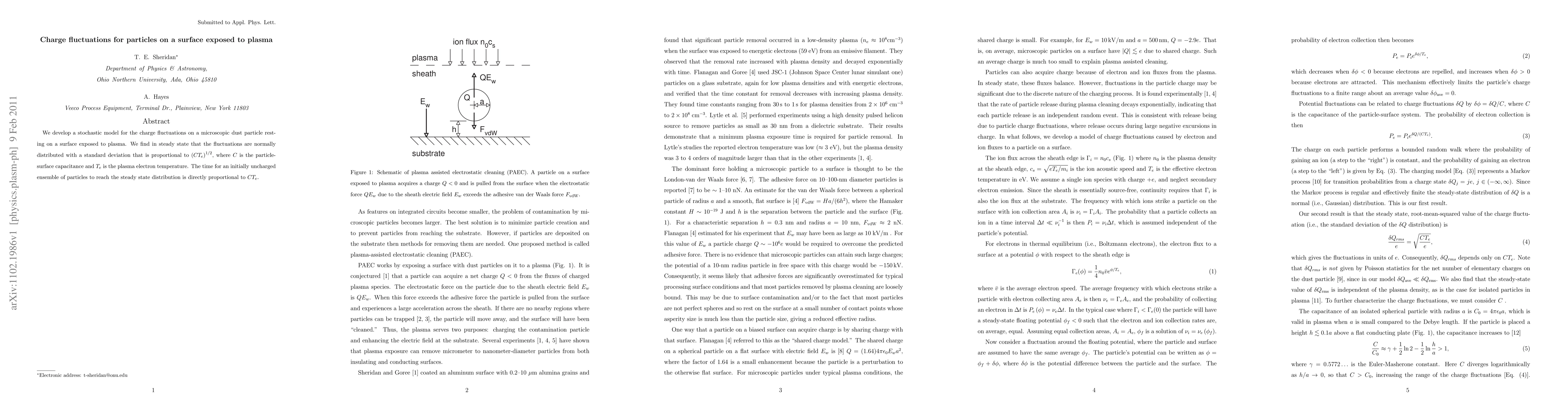 We develop a stochastic model for the charge fluctuations on a microscopic dust particle resting on a surface exposed to plasma. We find in steady state that the fluctuations are normally distributed with a standard deviation that is proportional to $CT_{e})^{1/2}$, where $C$ is the particle-surface capacitance and $T_{e}$ is the plasma electron temperature. The time for an initially uncharged ensemble of particles to reach the steady state distribution is directly proportional to $CT_{e}$.