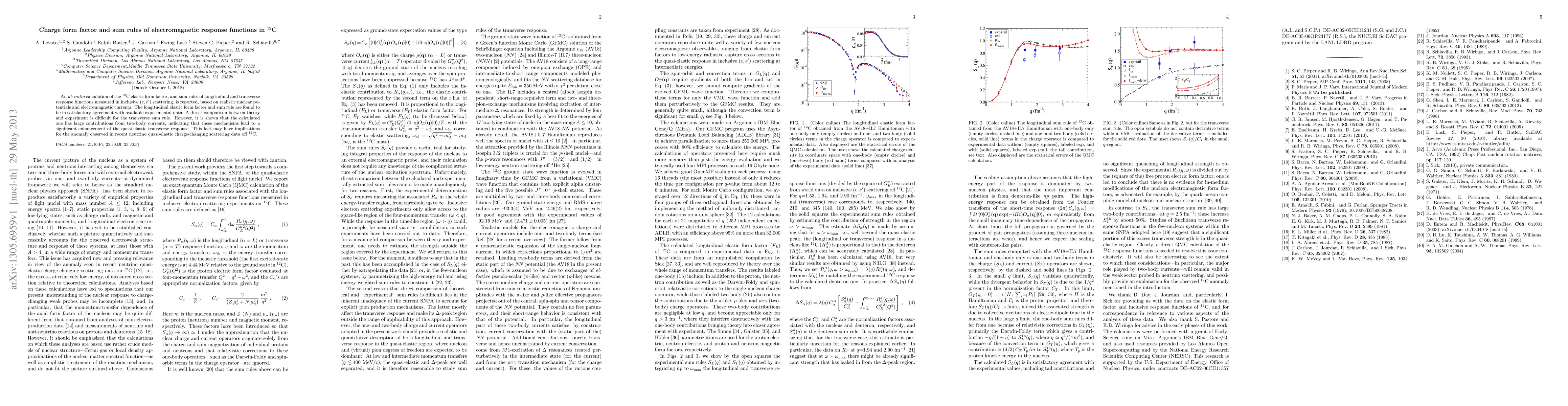 An "ab initio" calculation of the Carbon-12 elastic form factor, and sum rules of longitudinal and transverse response functions measured in inclusive (e,e') scattering, is reported, based on realistic nuclear potentials and electromagnetic currents. The longitudinal elastic form factor and sum rule are found to be in satisfactory agreement with available experimental data. A direct comparison between theory and experiment is difficult for the transverse sum rule. However, it is shown that the calculated one has large contributions from two-body currents, indicating that these mechanisms lead to a significant enhancement of the quasi-elastic transverse response. This fact may have implications for the anomaly observed in recent neutrino quasi-elastic charge-changing scattering data off Carbon-12.