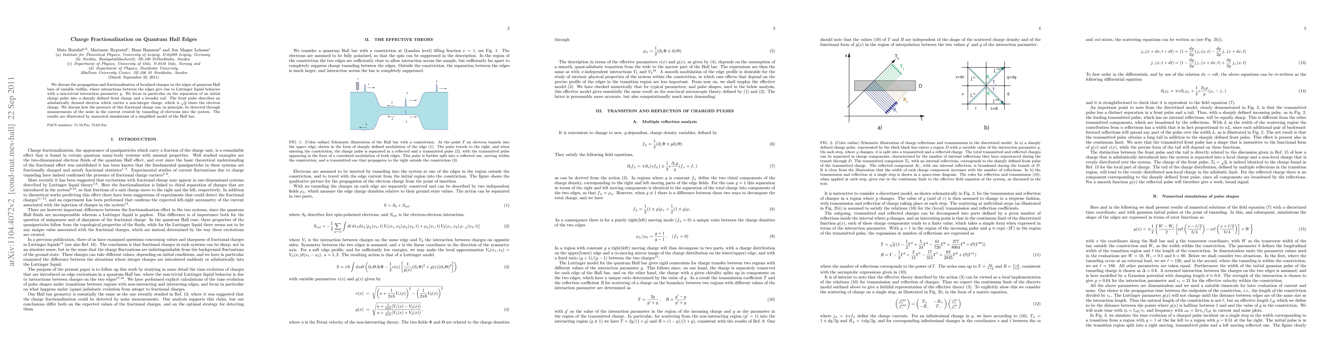 This paper explores the fractionalization of charges on quantum Hall edges, revealing a non-integer charge (\(\sqrt{g}\) times the electron charge) due to interactions, and proposes that this can be detected via current noise measurements from electron tunneling. Numerical simulations support the theoretical findings.
