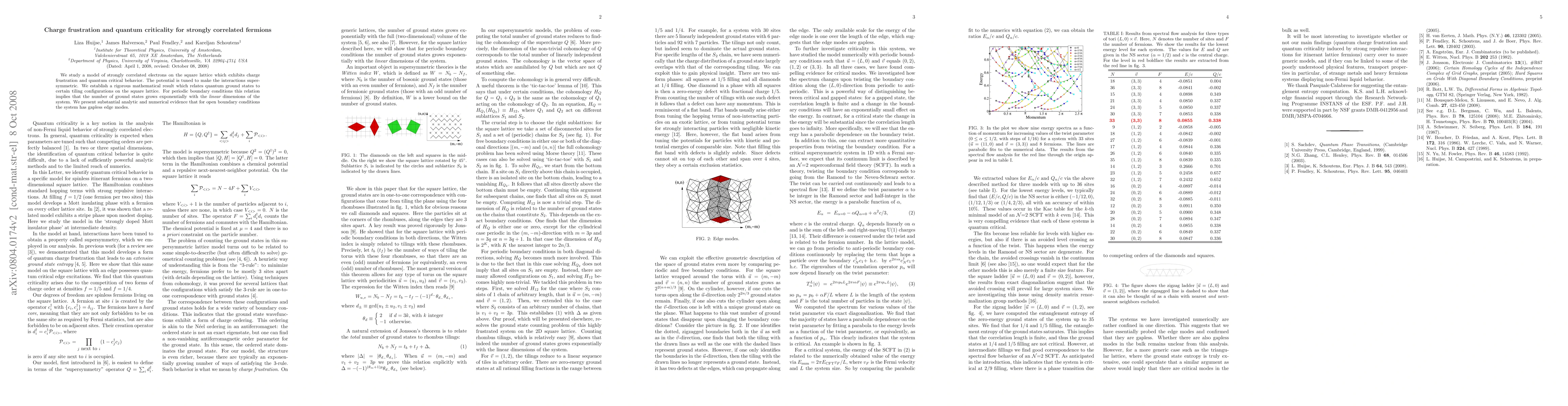 We study a model of strongly correlated electrons on the square lattice which exhibits charge frustration and quantum critical behavior. The potential is tuned to make the interactions supersymmetric. We establish a rigorous mathematical result which relates quantum ground states to certain tiling configurations on the square lattice. For periodic boundary conditions this relation implies that the number of ground states grows exponentially with the linear dimensions of the system. We present substantial analytic and numerical evidence that for open boundary conditions the system has gapless edge modes.