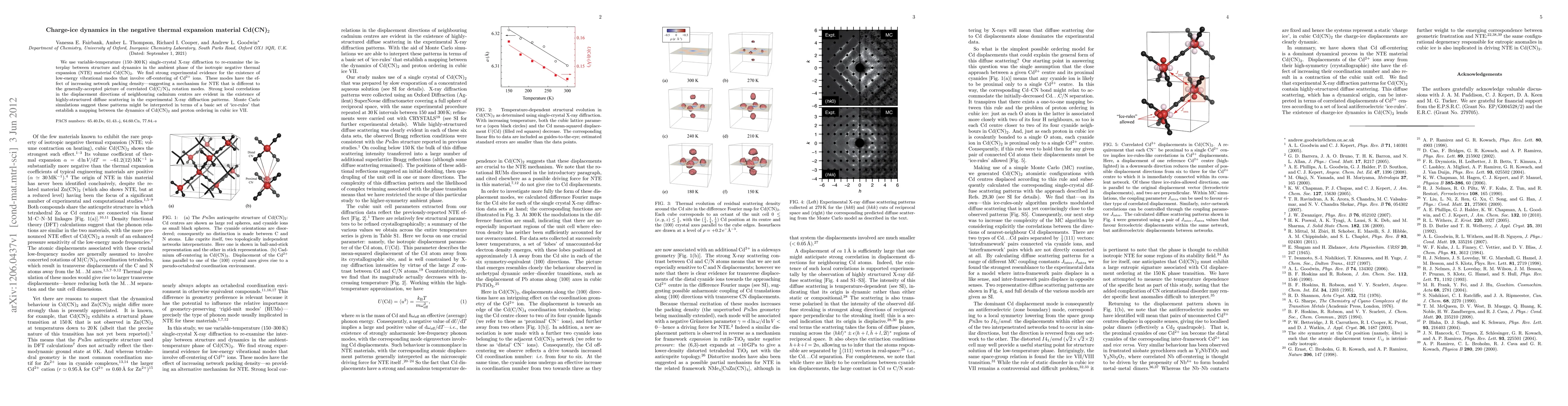 We use variable-temperature (150--300\,K) single-crystal X-ray diffraction to re-examine the interplay between structure and dynamics in the ambient phase of the isotropic negative thermal expansion (NTE) material Cd(CN)$_2$. We find strong experimental evidence for the existence of low-energy vibrational modes that involve off-centering of Cd$^{2+}$ ions. These modes have the effect of increasing network packing density---suggesting a mechanism for NTE that is different to the generally-accepted picture of correlated Cd(C/N)$_4$ rotation modes. Strong local correlations in the displacement directions of neighbouring cadmium centres are evident in the existence of highly-structured diffuse scattering in the experimental X-ray diffraction patterns. Monte Carlo simulations suggest these patterns might be interpreted in terms of a basic set of `ice-rules' that establish a mapping between the dynamics of Cd(CN)$_2$ and proton ordering in cubic ice VII.
