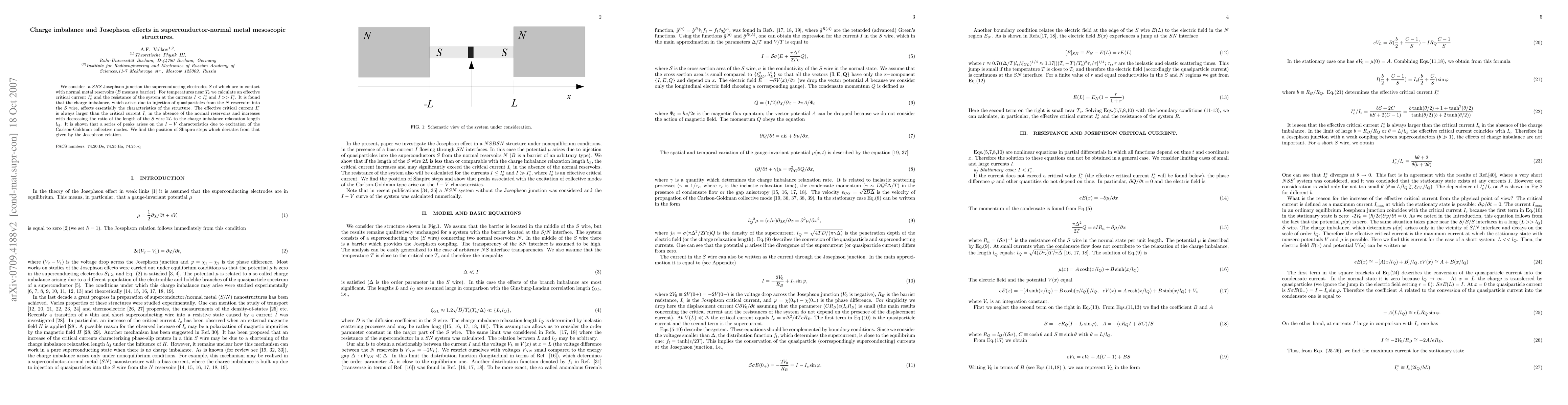 This paper investigates the charge imbalance and Josephson effects in superconductor-normal metal mesoscopic structures, finding that quasiparticle injection from normal reservoirs increases the effective critical current and causes deviations in the $I-V$ characteristics due to collective modes. The Shapiro steps' positions differ from the Josephson relation predictions.