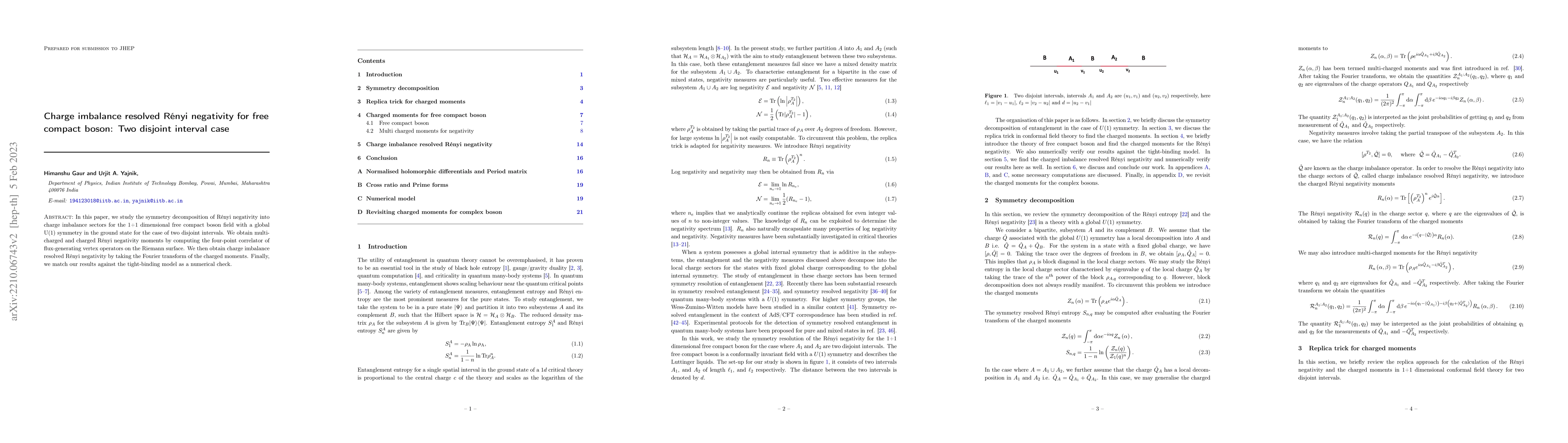 This paper investigates the symmetry decomposition of Rényi negativity into charge imbalance sectors for a 1+1 dimensional free compact boson field, focusing on two disjoint intervals. It computes the four-point correlator to obtain multi-charged and charged Rényi negativity moments, and resolves the Rényi negativity by Fourier transforming the charged moments, verifying results with a numerical tight-binding model.