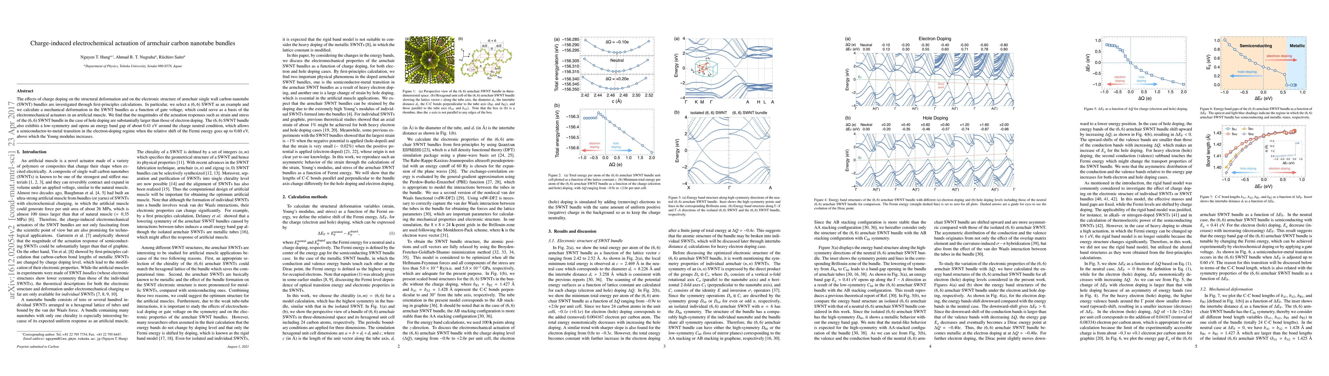 The effects of charge doping on the structural deformation and on the electronic structure of armchair single wall carbon nanotube (SWNT) bundles are investigated through first-principles calculations. In particular, we select a (6; 6) SWNT as an example and we calculate a mechanical deformation in the SWNT bundles as a function of gate voltage, which could serve as a basis of the electromechanical actuators in an artificial muscle. We find that the magnitudes of the actuation responses such as strain and stress of the (6; 6) SWNT bundle in the case of hole doping are substantially larger than those of electron doping. The (6; 6) SWNT bundle also exhibits a low-symmetry and opens an energy band gap of about 0.41 eV around the charge neutral condition, which allows a semiconductor-to-metal transition in the electron-doping regime when the relative shift of the Fermi energy goes up to 0.60 eV, above which the Young modulus increases.