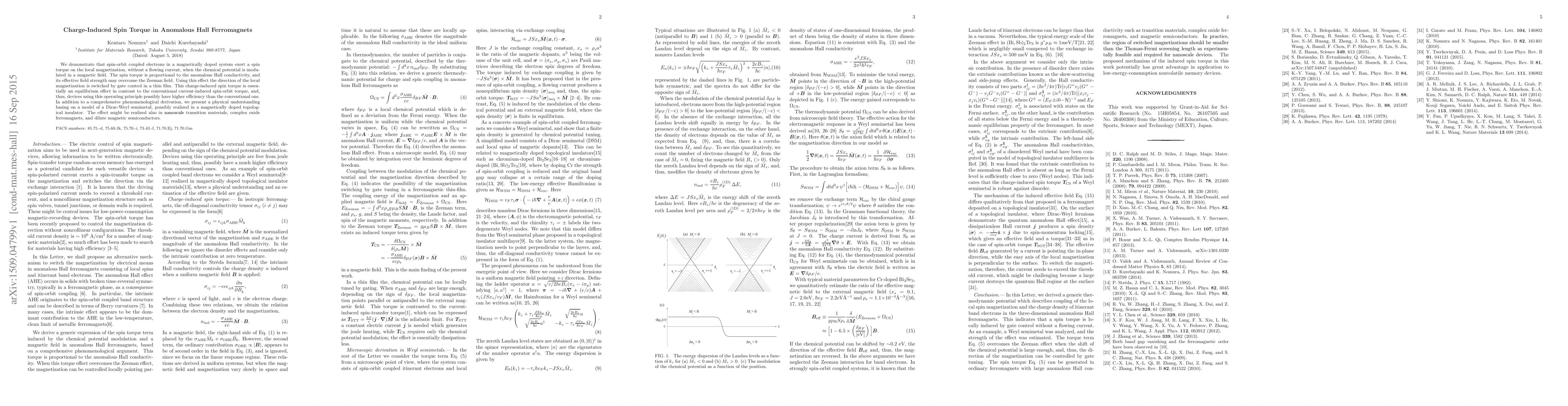 The research demonstrates a charge-induced spin torque effect in anomalous Hall ferromagnets through a theoretical model involving spin-orbit coupled electrons and local magnetic moments, interacting via exchange coupling in a Weyl semimetal framework.