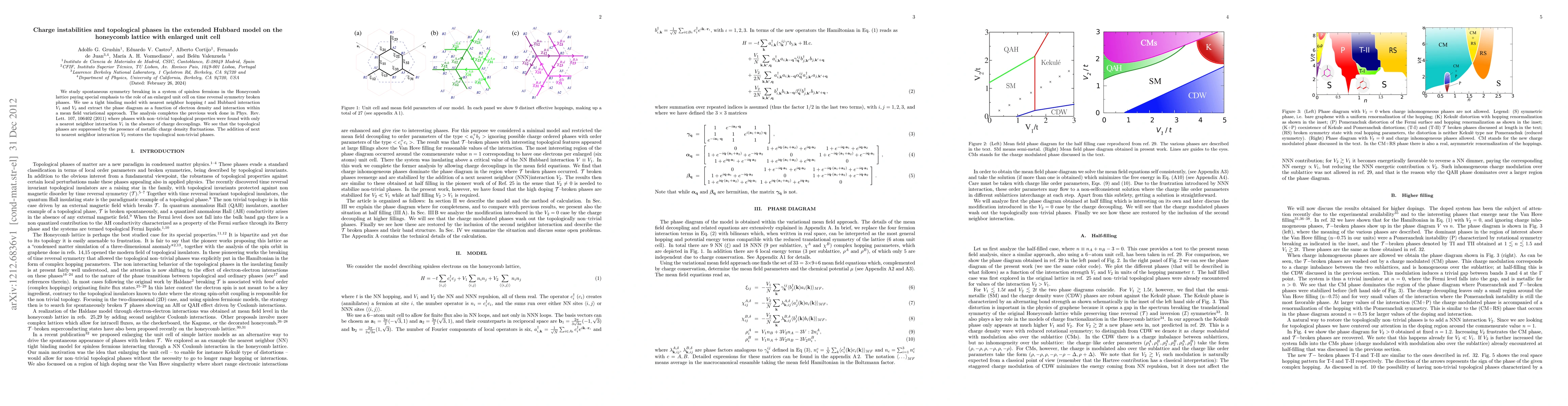 We study spontaneous symmetry breaking in a system of spinless fermions in the Honeycomb lattice paying special emphasis to the role of an enlarged unit cell on time reversal symmetry broken phases. We use a tight binding model with nearest neighbor hopping t and Hubbard interaction V1 and V2 and extract the phase diagram as a function of electron density and interaction within a mean field variational approach. The analysis completes the previous work done in Phys. Rev. Lett. 107, 106402 (2011) where phases with non--trivial topological properties were found with only a nearest neighbor interaction V1 in the absence of charge decouplings. We see that the topological phases are suppressed by the presence of metallic charge density fluctuations. The addition of next to nearest neighbor interaction V2 restores the topological non-trivial phases.