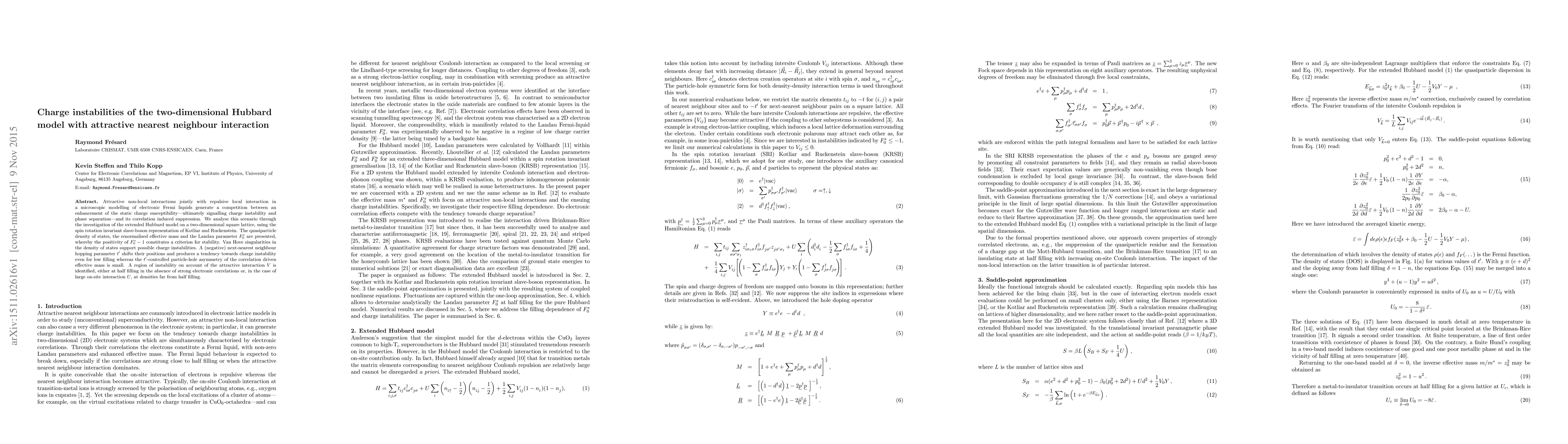 Attractive non-local interactions jointly with repulsive local interaction in a microscopic modelling of electronic Fermi liquids generate a competition between an enhancement of the static charge susceptibility---ultimately signalling charge instability and phase separation---and its correlation induced suppression. We analyse this scenario through the investigation of the extended Hubbard model on a two-dimensional square lattice, using the spin rotation invariant slave-boson representation of Kotliar and Ruckenstein. The quasiparticle density of states, the renormalised effective mass and the Landau parameter $F_0^s$ are presented, whereby the positivity of $F_0^s-1$ constitutes a criterion for stability. Van Hove singularities in the density of states support possible charge instabilities. A (negative) next-nearest neighbour hopping parameter $t'$ shifts their positions and produces a tendency towards charge instability even for low filling whereas the $t'$-controlled particle-hole asymmetry of the correlation driven effective mass is small. A region of instability on account of the attractive interaction $V$ is identified, either at half filling in the absence of strong electronic correlations or, in the case of large on-site interaction $U$, at densities far from half filling.