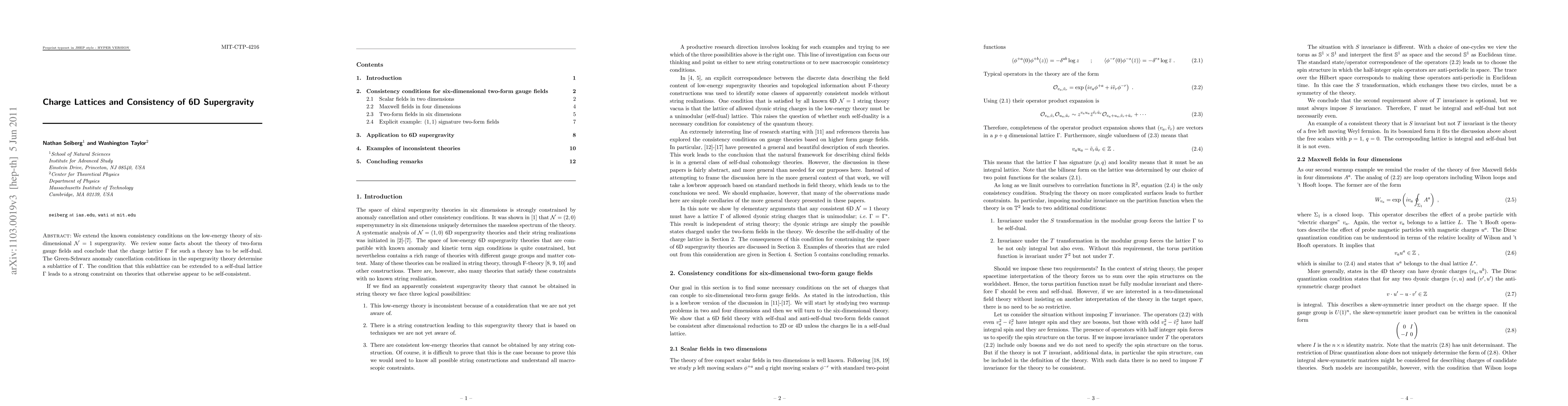 We extend the known consistency conditions on the low-energy theory of six-dimensional N = 1 supergravity. We review some facts about the theory of two-form gauge fields and conclude that the charge lattice Gamma for such a theory has to be self-dual. The Green-Schwarz anomaly cancellation conditions in the supergravity theory determine a sublattice of Gamma. The condition that this sublattice can be extended to a self-dual lattice Gamma leads to a strong constraint on theories that otherwise appear to be self-consistent.