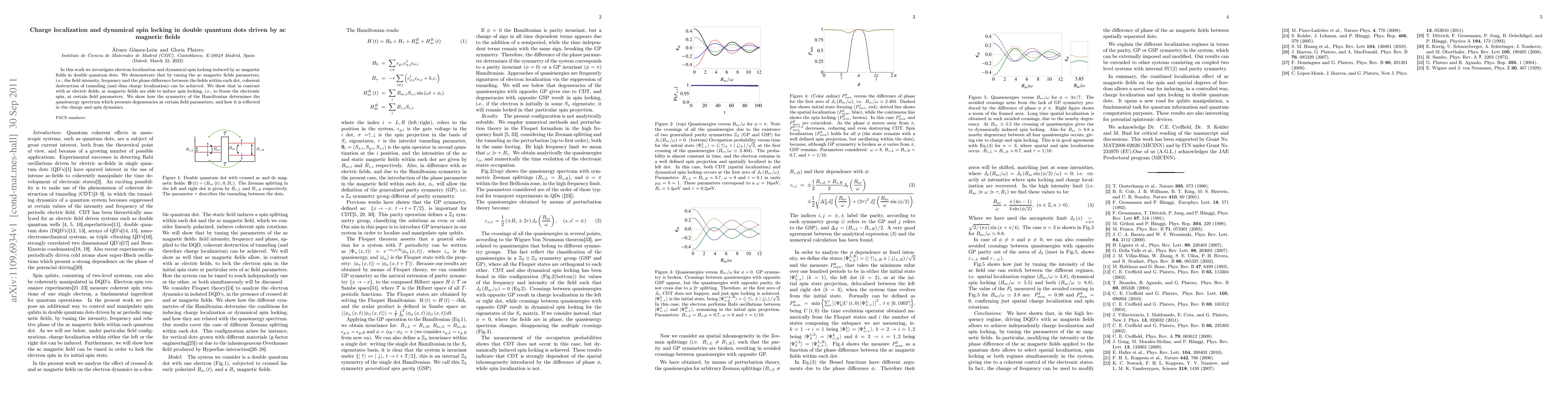 This paper explores electron localization and spin locking in double quantum dots under ac magnetic fields. It demonstrates that adjusting the field's intensity, frequency, and phase can lead to coherent destruction of tunneling and charge localization, while ac magnetic fields can induce spin locking unlike ac electric fields. The symmetry of the Hamiltonian influences the quasienergy spectrum and affects charge and spin dynamics.