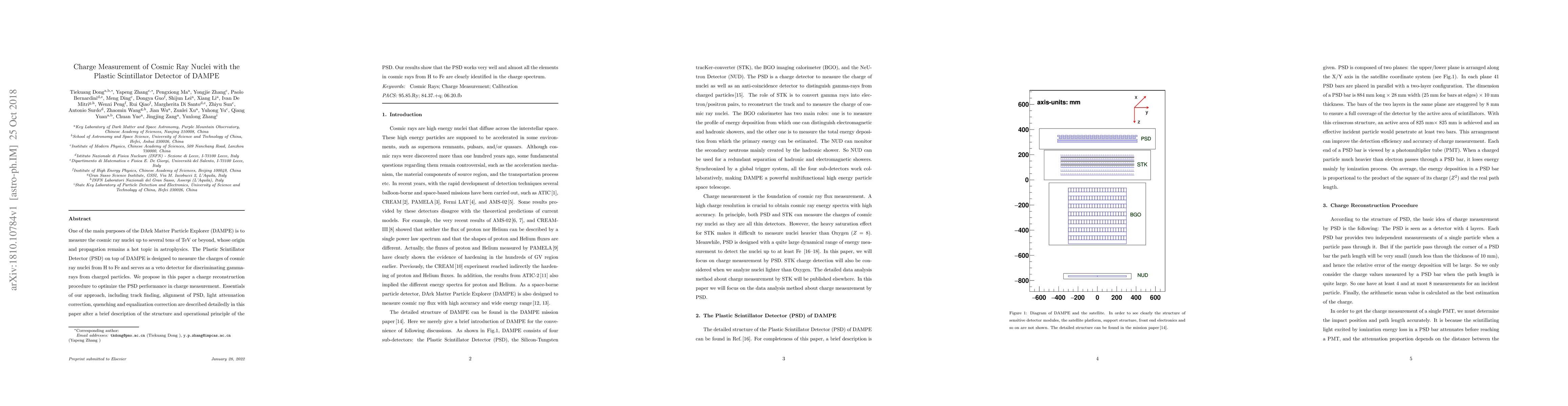 The DArk Matter Particle Explorer (DAMPE) employs a Plastic Scintillator Detector (PSD) to measure the charges of cosmic ray nuclei, optimizing its performance through detailed charge reconstruction procedures. The PSD successfully identifies cosmic rays from hydrogen to iron, demonstrating effective discrimination of gamma-rays from charged particles.