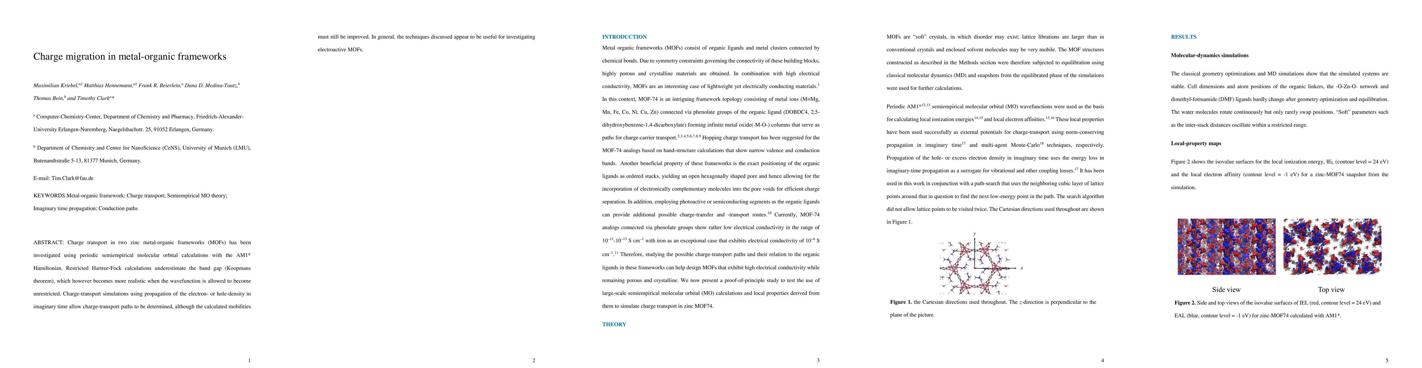 Charge transport in two zinc metal-organic frameworks (MOFs) has been investigated using periodic semiempirical molecular orbital calculations with the AM1* Hamiltonian. Restricted Hartree-Fock calculations underestimate the band gap (Koopmans theorem), which however becomes more realistic when the wavefunction is allowed to become unrestricted. Charge-transport simulations using propagation of the electron- or hole-density in imaginary time allow charge-transport paths to be determined, although the calculated mobilities must still be improved. In general, the techniques discussed appear to be useful for investigating electroactive MOFs.