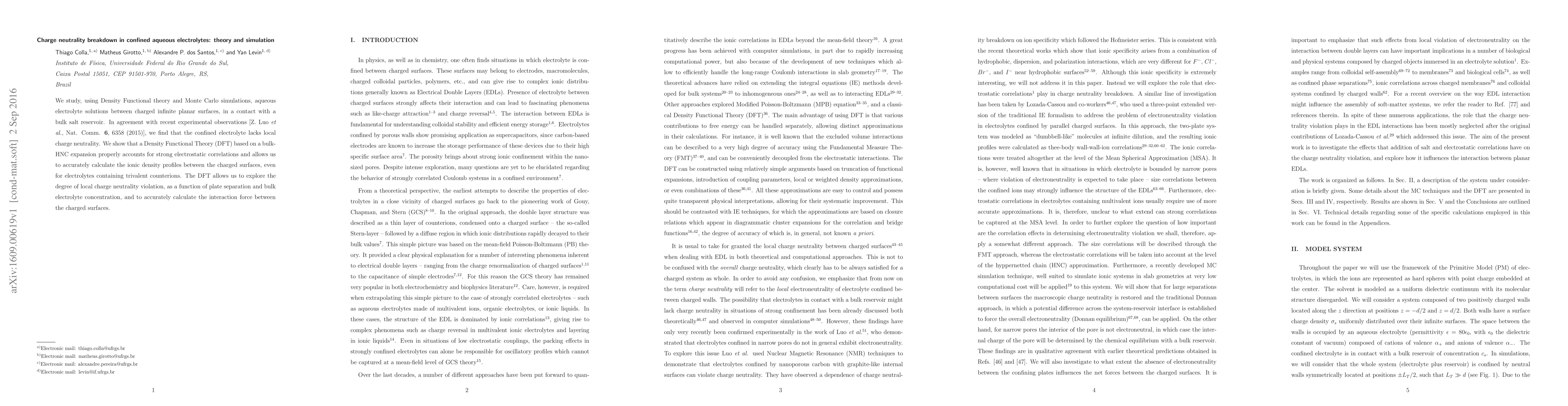This paper uses Density Functional Theory and Monte Carlo simulations to investigate confined aqueous electrolyte solutions between charged surfaces, finding a breakdown in local charge neutrality. A DFT based on a bulk-HNC expansion accurately calculates ionic density profiles and interaction forces, revealing strong electrostatic correlations.