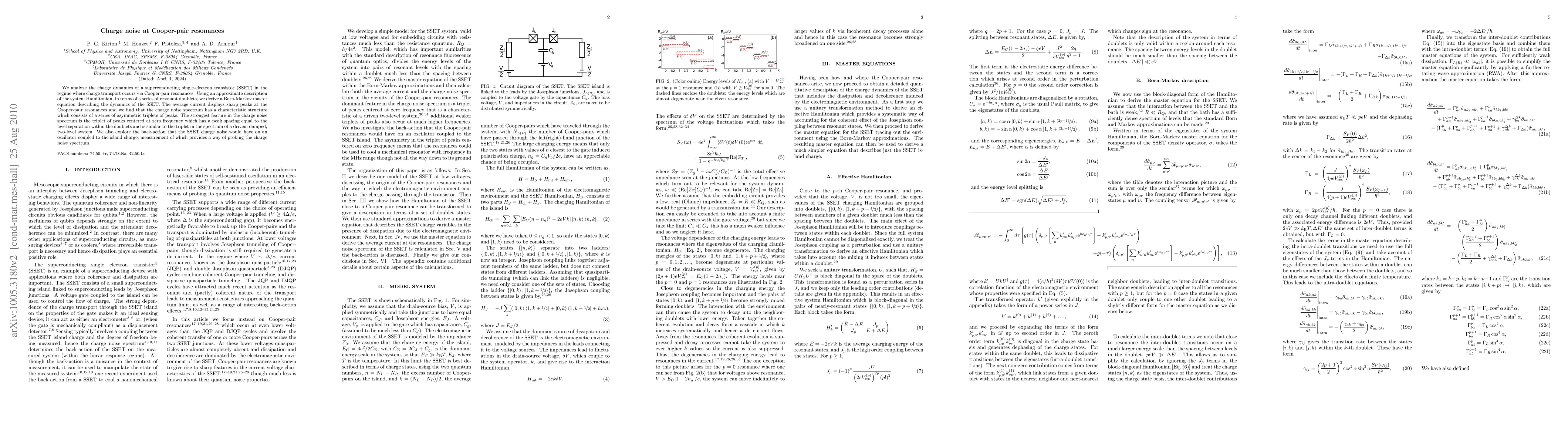 We analyze the charge dynamics of a superconducting single-electron transistor (SSET) in the regime where charge transport occurs via Cooper-pair resonances. Using an approximate description of the system Hamiltonian, in terms of a series of resonant doublets, we derive a Born-Markov master equation describing the dynamics of the SSET. The average current displays sharp peaks at the Cooper-pair resonances and we find that the charge noise spectrum has a characteristic structure which consists of a series of asymmetric triplets of peaks. The strongest feature in the charge noise spectrum is the triplet of peaks centered at zero frequency which has a peak spacing equal to the level separation within the doublets and is similar to the triplet in the spectrum of a driven, damped, two-level system. We also explore the back-action that the SSET charge noise would have on an oscillator coupled to the island charge, measurement of which provides a way of probing the charge noise spectrum.
