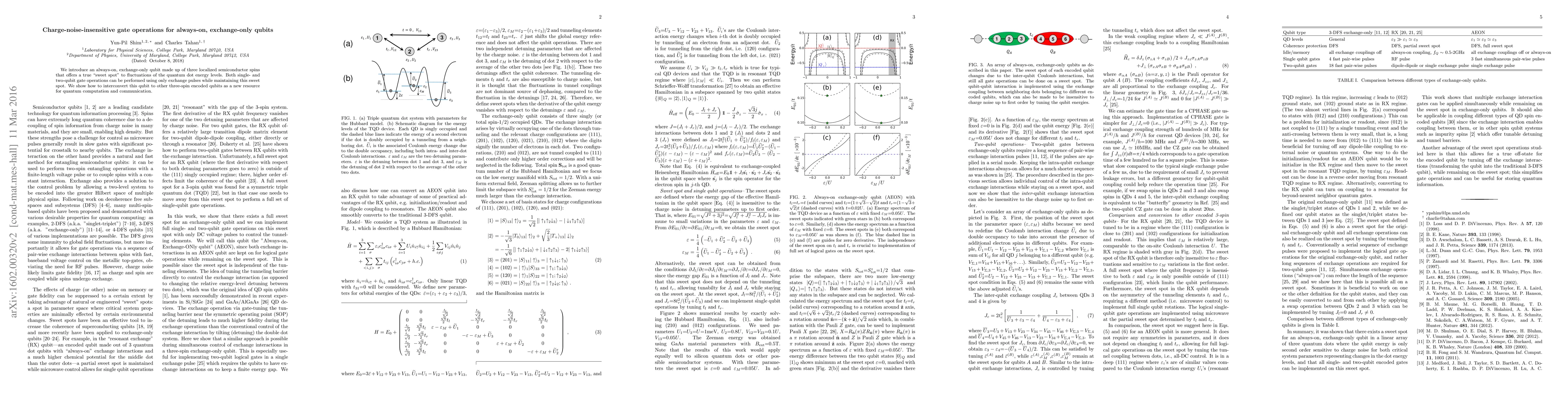 This paper presents an always-on, exchange-only qubit utilizing three semiconductor spins, which offers immunity to charge noise fluctuations. It enables both single- and two-qubit gate operations via exchange pulses, and introduces a method to convert this qubit to other three-spin encoded qubits for quantum computation and communication.