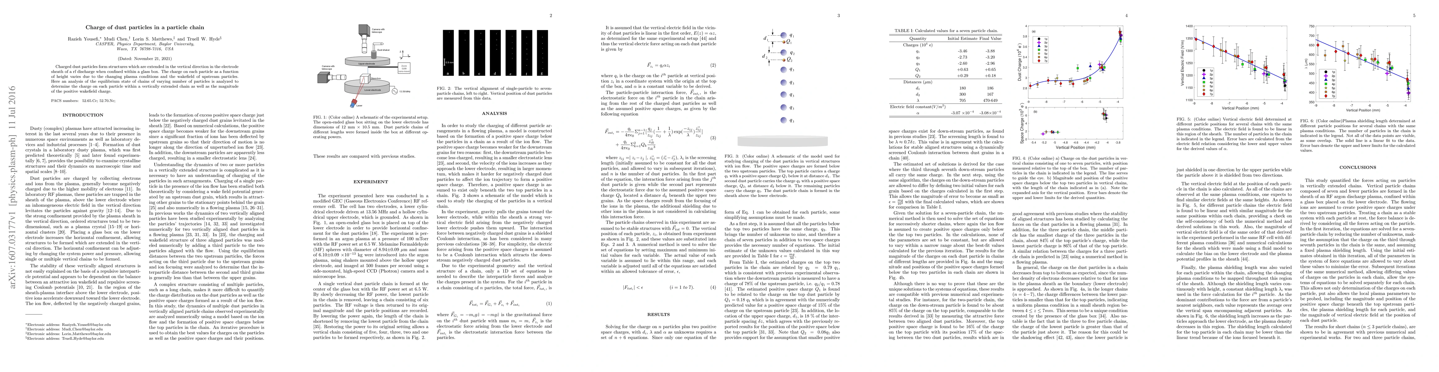 Researchers studied how charged dust particles arrange themselves in chains within an electrical discharge, finding that their charges vary along the chain due to changing plasma conditions and wakefield effects. This helps understand the behavior of dust particles in such discharges.