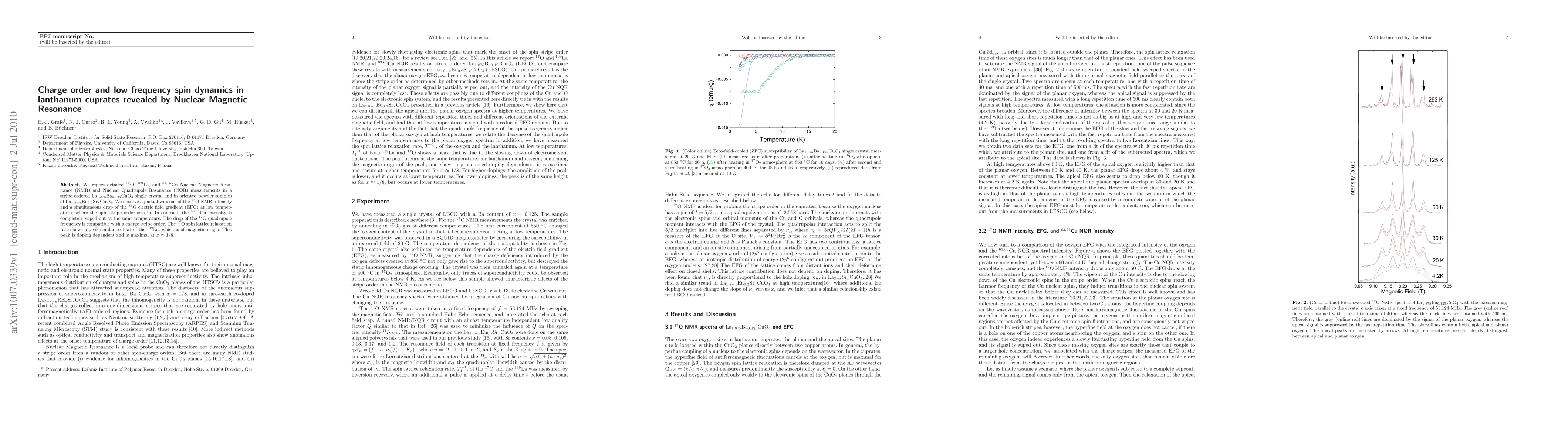 This study uses NMR and NQR to investigate charge order and spin dynamics in lanthanum cuprates, finding that 17O NMR intensity partially decreases while 63Cu intensity is completely wiped out at low temperatures, indicating the presence of both charge and spin stripe orders. The peak in 17O spin lattice relaxation rate suggests a magnetic origin, with maximal intensity at specific doping levels.