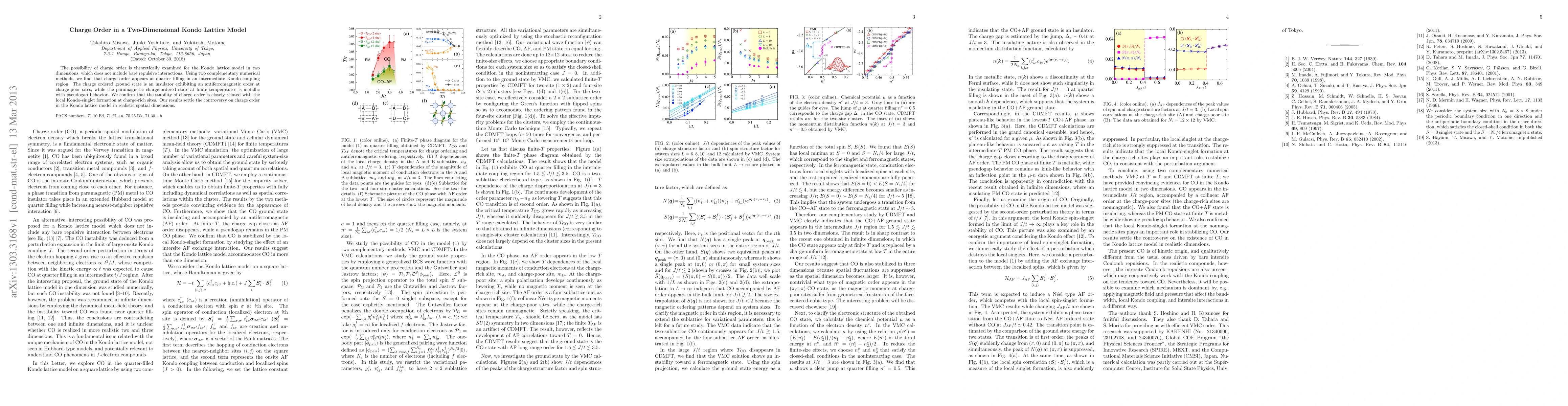 This paper examines charge order in a two-dimensional Kondo lattice model without repulsive interactions, finding that charge order emerges at quarter filling. Charge order results in an insulating antiferromagnetic ground state and a metallic paramagnetic state with pseudogap behavior, confirming its stability is linked to local Kondo-singlet formation.