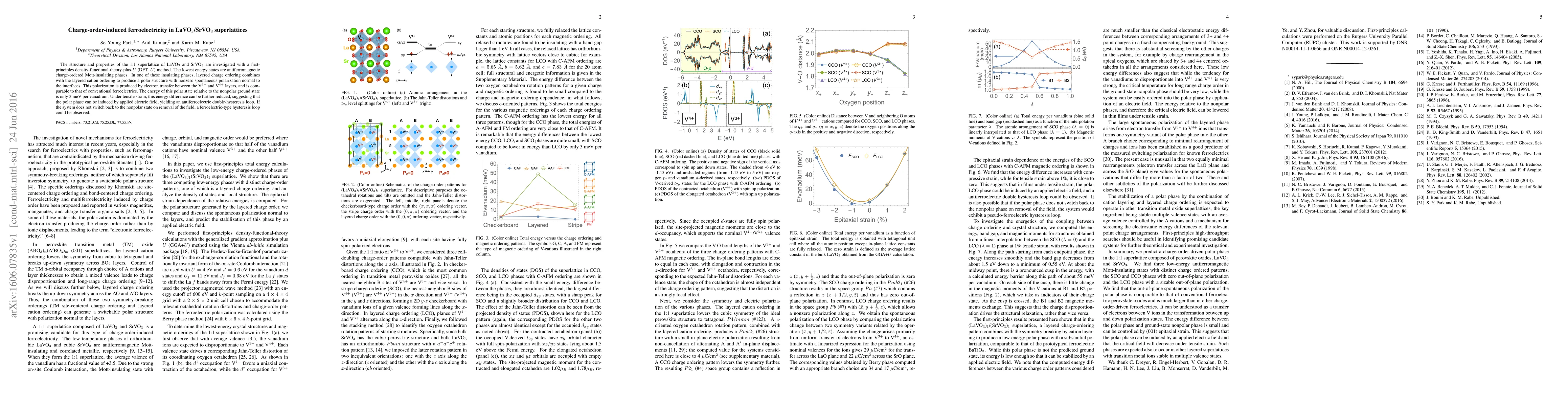 The structure and properties of the 1:1 superlattice of LaVO$_{3}$ and SrVO$_{3}$ are investigated with a first-principles density-functional-theory-plus-$U$ (DFT+$U$) method. The lowest energy states are antiferromagnetic charge-ordered Mott-insulating phases. In one of these insulating phases, layered charge ordering combines with the layered cation ordering to produce a polar structure with nonzero spontaneous polarization normal to the interfaces. This polarization is produced by electron transfer between the V$^{3+}$ and V$^{4+}$ layers, and is comparable to that of conventional ferroelectrics. The energy of this polar state relative to the nonpolar ground state is only 3 meV per vanadium. Under tensile strain, this energy difference can be further reduced, suggesting that the polar phase can be induced by applied electric field, yielding an antiferroelectric double-hysteresis loop. If the system does not switch back to the nonpolar state on removal of the field, a ferroelectric-type hysteresis loop could be observed.