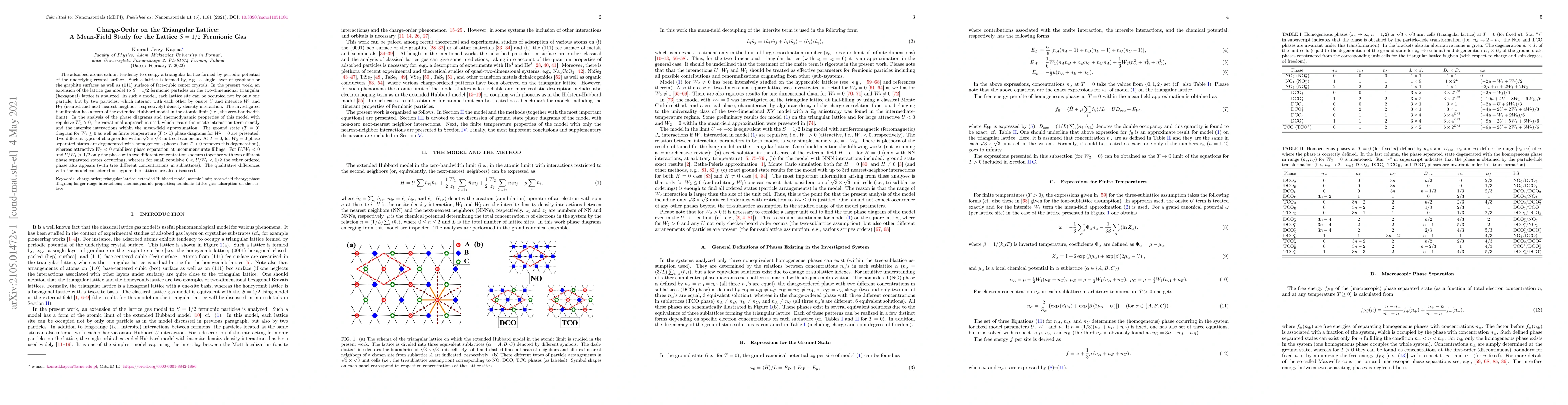 The adsorbed atoms exhibit tendency to occupy a triangular lattice formed by periodic potential of the underlying crystal surface. Such a lattice is formed by, e.g., a single layer of graphane or the graphite surfaces as well as (111) surface of face-cubic center crystals. In the present work, an extension of the lattice gas model to $S=1/2$ fermionic particles on the two-dimensional triangular (hexagonal) lattice is analyzed. In such a model, each lattice site can be occupied not by only one particle, but by two particles, which interact with each other by onsite $U$ and intersite $W_{1}$ and $W_{2}$ (nearest and next-nearest-neighbor, respectively) density-density interaction. The investigated hamiltonian has a form of the extended Hubbard model in the atomic limit (i.e., the zero-bandwidth limit). In the analysis of the phase diagrams and thermodynamic properties of this model with repulsive $W_{1}>0$, the variational approach is used, which treats the onsite interaction term exactly and the intersite interactions within the mean-field approximation. The ground state ($T=0$) diagram for $W_{2}\leq0$ as well as finite temperature ($T>0$) phase diagrams for $W_{2}=0$ are presented. Two different types of charge order within $\sqrt{3} \times \sqrt{3}$ unit cell can occur. At $T=0$, for $W_{2}=0$ phase separated states are degenerated with homogeneous phases (but $T>0$ removes this degeneration), whereas attractive $W_2<0$ stabilizes phase separation at incommensurate fillings. For $U/W_{1}<0$ and $U/W_{1}>1/2$ only the phase with two different concentrations occurs (together with two different phase separated states occurring), whereas for small repulsive $0