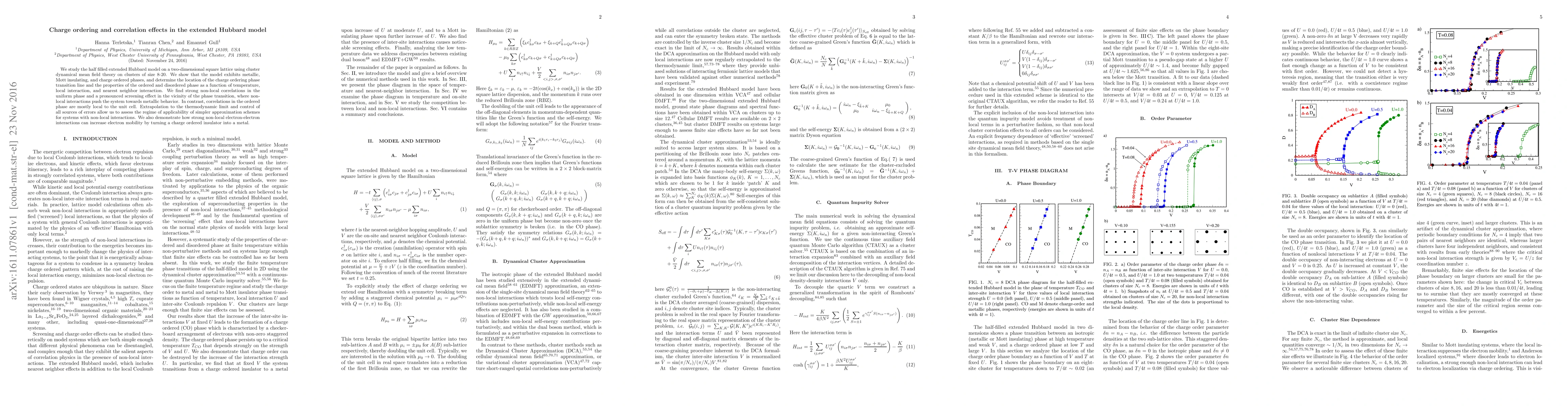 We study the half filled extended Hubbard model on a two-dimensional square lattice using cluster dynamical mean field theory on clusters of size 8-20. We show that the model exhibits metallic, Mott insulating, and charge ordered phases, and determine the location of the charge ordering phase transition line and the properties of the ordered and disordered phase as a function of temperature, local interaction, and nearest neighbor interaction. We find strong non-local correlations in the uniform phase and a pronounced screening effect in the vicinity of the phase transition, where non-local interactions push the system towards metallic behavior. In contrast, correlations in the ordered phase are mostly local to the unit cell. Extrapolation to the thermodynamic limit and control of all sources of errors allow us to assess the regime of applicability of simpler approximation schemes for systems with non-local interactions. We also demonstrate how strong non-local electron-electron interactions can increase electron mobility by turning a charge ordered insulator into a metal.