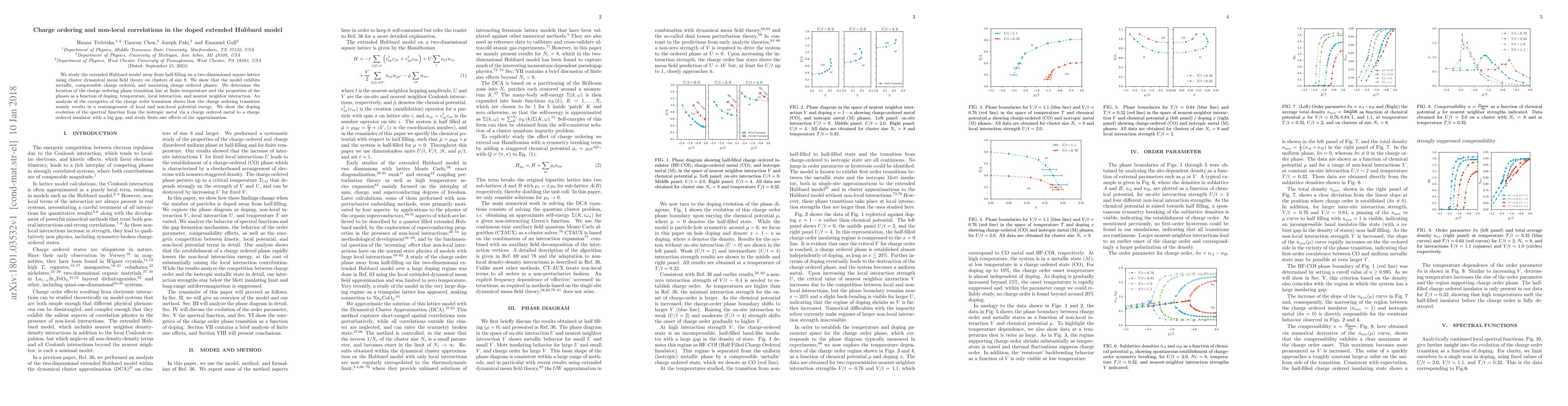 This paper investigates the extended Hubbard model on a 2D square lattice using cluster dynamical mean field theory, revealing metallic, compressible, and insulating charge ordered phases. The study identifies the charge ordering phase transition line and analyzes the impact of doping, temperature, and interactions, showing that charge ordering primarily affects local and non-local potential energy.