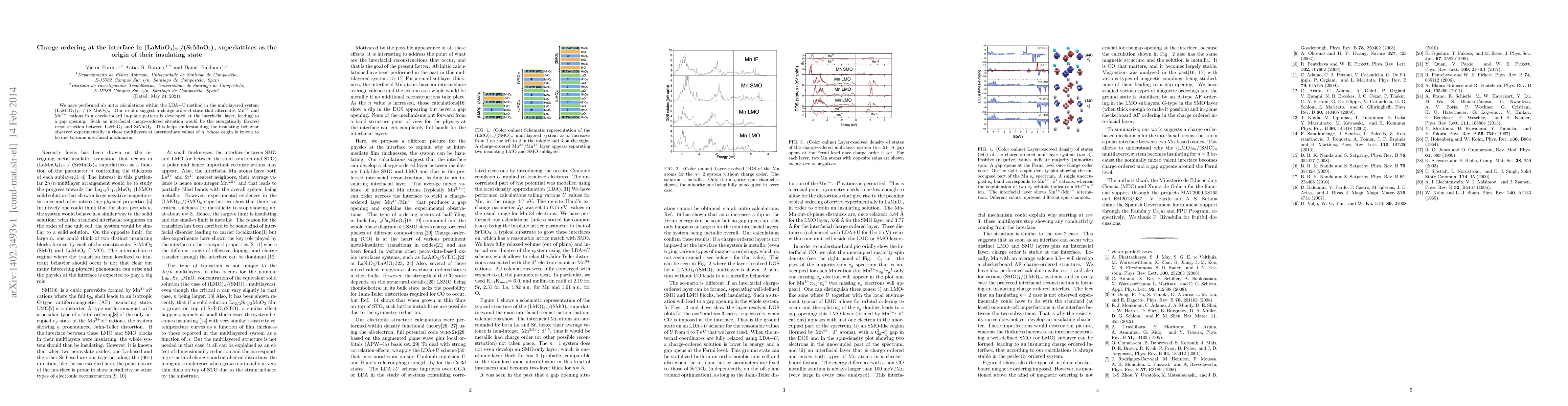 We have performed ab initio calculations within the LDA+U method in the multilayered system (LaMnO$_3$)$_{2n}$ / (SrMnO$_3$)$_n$. Our results suggest a charge-ordered state that alternates Mn$^{3+}$ and Mn$^{4+}$ cations in a checkerboard in-plane pattern is developed at the interfacial layer, leading to a gap opening. Such an interfacial charge-ordered situation would be the energetically favored reconstruction between LaMnO$_3$ and SrMnO$_3$. This helps understanding the insulating behavior observed experimentally in these multilayers at intermediate values of $n$, whose origin is known to be due to some interfacial mechanism.