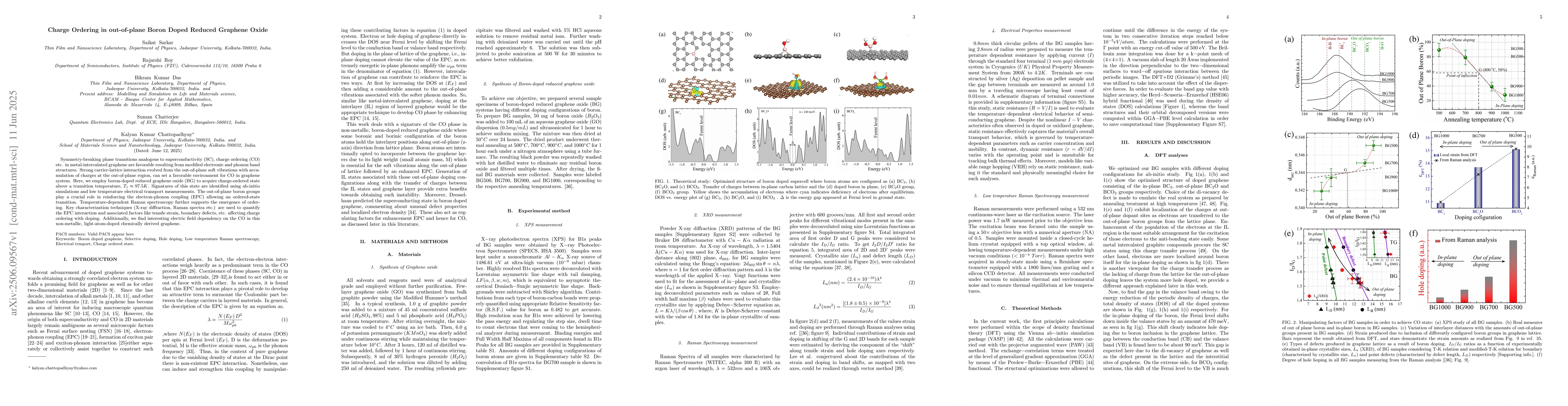 This research identifies a charge-ordered state in boron-doped reduced graphene oxide above 97.5 K, facilitated by strong electron-phonon coupling. The study uses ab-initio simulations and electrical transport measurements, finding that out-of-plane boron groups enhance this coupling, supporting the charge ordering. Techniques like X-ray diffraction and Raman spectroscopy quantify the interaction, revealing tensile strain and boundary defects impact the process.