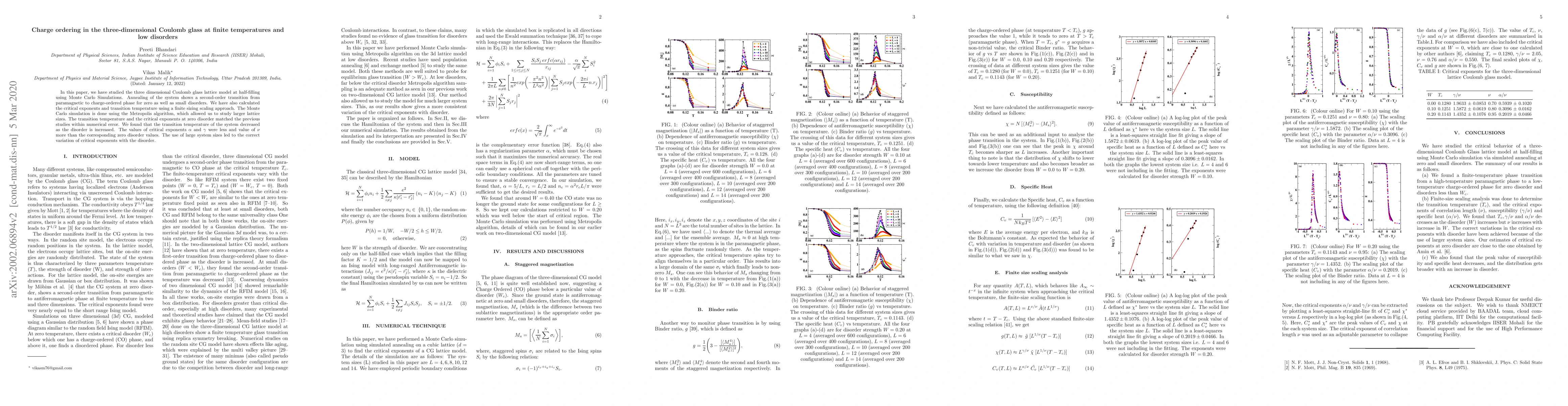 In this paper, we have studied the three dimensional Coulomb glass lattice model at half-filling using Monte Carlo Simulations. Annealing of the system shows a second-order transition from paramagnetic to charge-ordered phase for zero as well as small disorders. We have also calculated the critical exponents and transition temperature using a finite sizing scaling approach. The Monte Carlo simulation is done using the Metropolis algorithm, which allowed us to study larger lattice sizes. The transition temperature and the critical exponents at zero disorder matched the previous studies within numerical error. We found that the transition temperature of the system decreased as the disorder is increased. The values of critical exponents $\alpha$ and $\gamma$ were less and value of $\nu$ more than the corresponding zero disorder values. The use of large system sizes led to the correct variation of critical exponents with the disorder.