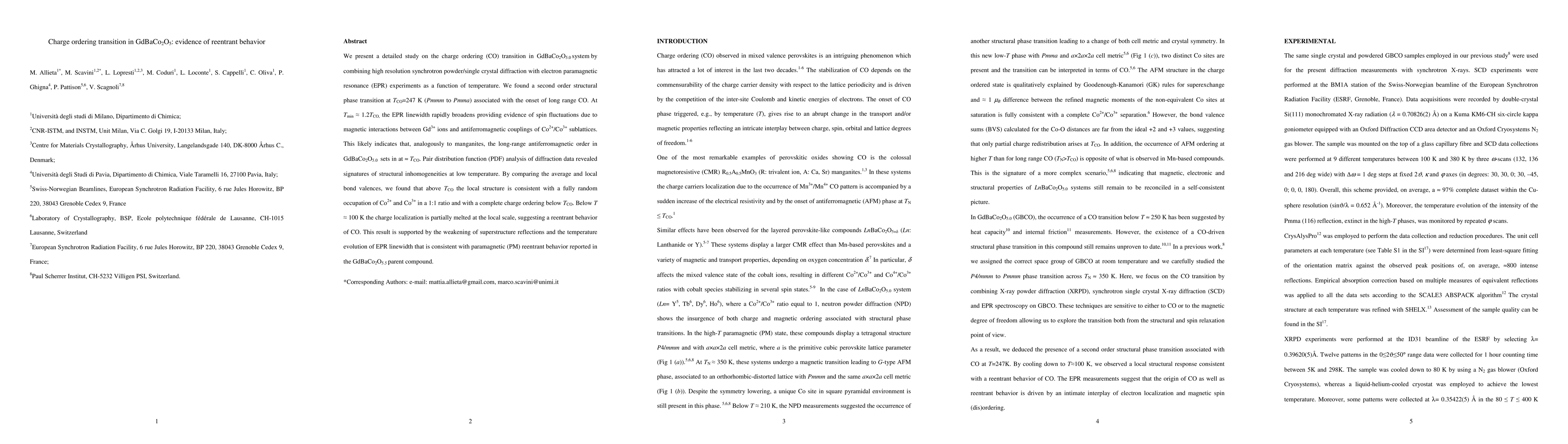 We present a detailed study on the charge ordering (CO) transition in GdBaCo2O5 system by combining high resolution synchrotron powder/single crystal diffraction with electron paramagnetic resonance (EPR) experiments as a function of temperature. We found a second order structural phase transition at TCO=247 K (Pmmm to Pmma) associated with the onset of long range CO. At Tmin = 1.2TCO, the EPR linewidth rapidly broadens providing evidence of spin fluctuations due to magnetic interactions between Gd3+ ions and antiferromagnetic couplings of Co2+/Co3+ sublattices. This likely indicates that, analogously to manganites, the long-range antiferromagnetic order in GdBaCo2O5 sets in at TCO. Pair distribution function (PDF) analysis of diffraction data revealed signatures of structural inhomogeneities at low temperature. By comparing the average and local bond valences, we found that above TCO the local structure is consistent with a fully random occupation of Co2+ and Co3+ in a 1:1 ratio and with a complete charge ordering below TCO. Below T = 100 K the charge localization is partially melted at the local scale, suggesting a reentrant behavior of CO. This result is supported by the weakening of superstructure reflections and the temperature evolution of EPR linewidth that is consistent with paramagnetic (PM) reentrant behavior reported in the GdBaCo2O5.5 parent compound.