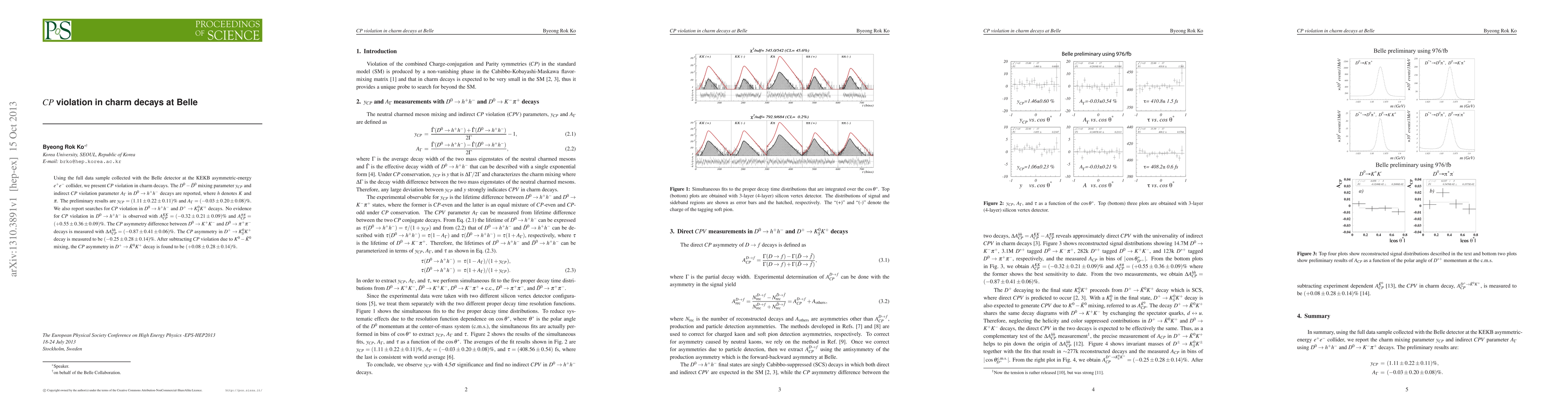 This paper reports CP violation in charm decays using the Belle detector data, finding $y_{CP}=(1.11\pm0.22\pm0.11)%$ and $A_{\Gamma}=(-0.03\pm0.20\pm0.08)%$ in $D^0$ decays. No significant CP violation is observed in $D^0\rightarrow h^+h^-$ and $D^+\rightarrow K^0_S K^+$ decays.