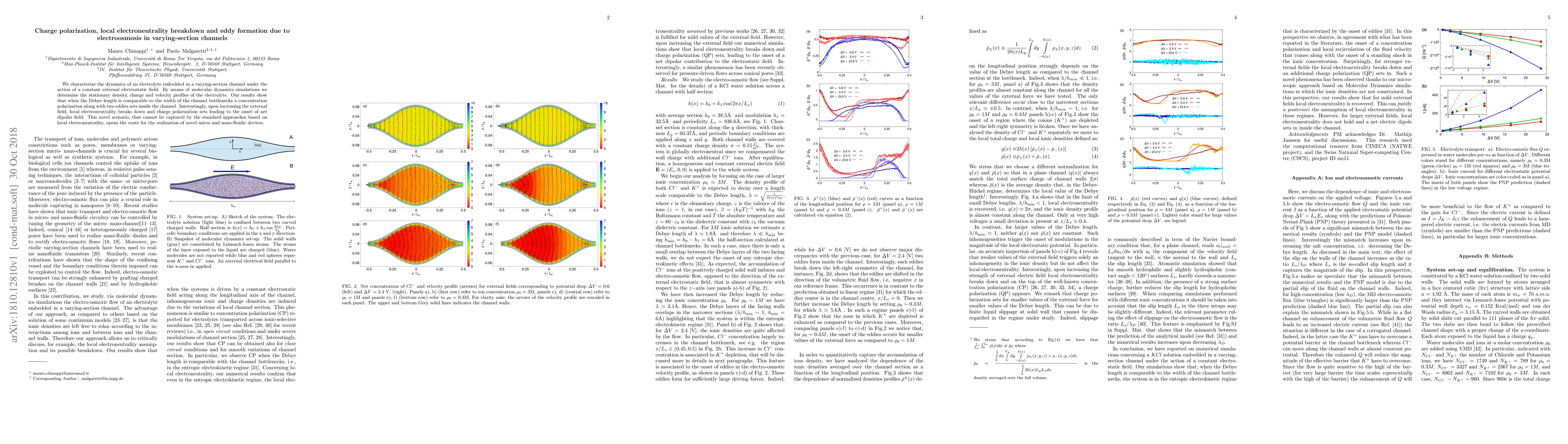 We characterize the dynamics of an electrolyte embedded in a varying-section channel under the action of a constant external electrostatic field. By means of molecular dynamics simulations we determine the stationary density, charge and velocity profiles of the electrolyte. Our results show that when the Debye length is comparable to the width of the channel bottlenecks a concentration polarization along with two eddies sets inside the channel. Interestingly, upon increasing the external field, local electroneutrality breaks down and charge polarization sets leading to the onset of net dipolar field. This novel scenario, that cannot be captured by the standard approaches based on local electroneutrality, opens the route for the realization of novel micro and nano-fluidic devices.