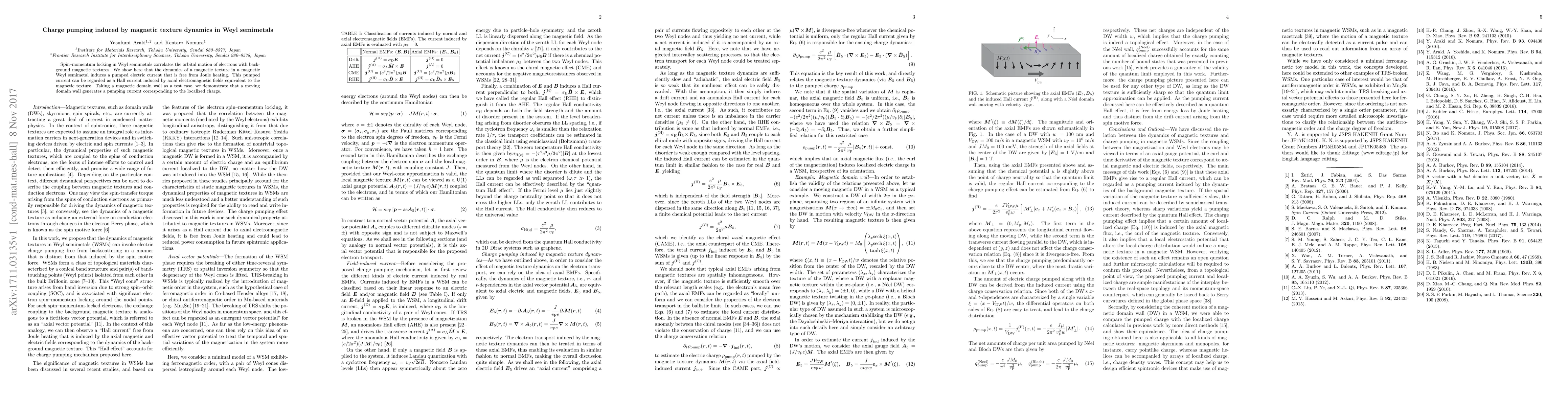Summary: Research demonstrates that magnetic texture dynamics in Weyl semimetals can induce a charge pumping current free from Joule heating, akin to a Hall current from axial electromagnetic fields, exemplified by a moving magnetic domain wall generating a localized pumping current.