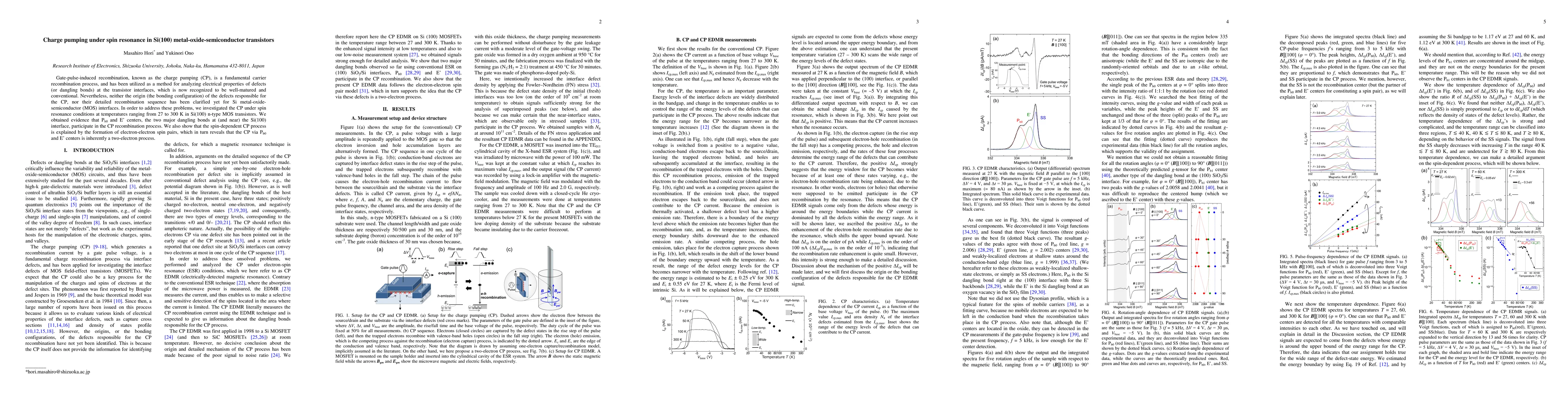 Gate-pulse-induced recombination, known as the charge pumping (CP), is a fundamental carrier recombination process, and has been utilized as a method for analyzing electrical properties of defects (or dangling bonds) at the transistor interfaces, which is now recognized to be well-matured and conventional. Nevertheless, neither the origin (the bonding configuration) of the defects responsible for the CP, nor their detailed recombination sequence has been clarified yet for Si metal-oxide-semiconductor (MOS) interfaces. In order to address these problems, we investigated the CP under spin resonance conditions at temperatures ranging from 27 to 300 K in Si(100) n-type MOS transistors. We obtained evidence that Pb0 and E' centers, the two major dangling bonds at (and near) the Si(100) interface, participate in the CP recombination process. We also show that the spin-dependent CP process is explained by the formation of electron-electron spin pairs, which in turn reveals that the CP via Pb0 and E' centers is inherently a two-electron process.