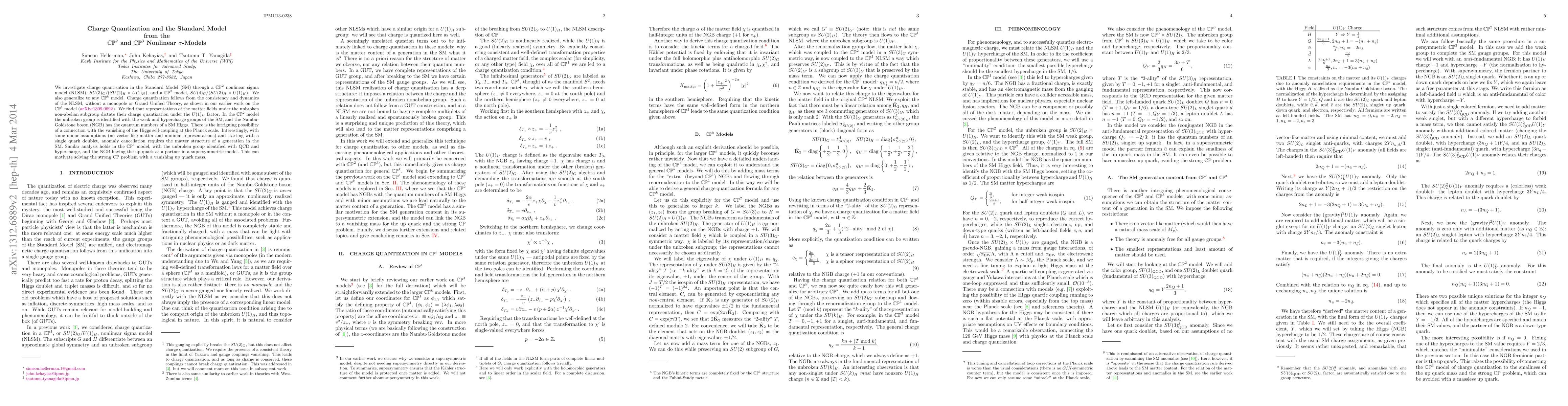 We investigate charge quantization in the Standard Model (SM) through a $\mathbb{CP}^2$ nonlinear sigma model (NLSM), $SU(3)_G/(SU(2)_H \times U(1)_H)$, and a $\mathbb{CP}^3$ model, $SU(4)_G/(SU(3)_H \times U(1)_H)$. We also generalize to any $\mathbb{CP}^k$ model. Charge quantization follows from the consistency and dynamics of the NLSM, without a monopole or Grand Unified Theory, as shown in our earlier work on the $\mathbb{CP}^1$ model (arXiv:1309.0692). We find that representations of the matter fields under the unbroken non-abelian subgroup dictate their charge quantization under the $U(1)_H$ factor. In the $\mathbb{CP}^2$ model the unbroken group is identified with the weak and hypercharge groups of the SM, and the Nambu-Goldstone boson (NGB) has the quantum numbers of a SM Higgs. There is the intriguing possibility of a connection with the vanishing of the Higgs self-coupling at the Planck scale. Interestingly, with some minor assumptions (no vector-like matter and minimal representations) and starting with a single quark doublet, anomaly cancellation requires the matter structure of a generation in the SM. Similar analysis holds in the $\mathbb{CP}^3$ model, with the unbroken group identified with QCD and hypercharge, and the NGB having the up quark as a partner in a supersymmetric model. This can motivate solving the strong CP problem with a vanishing up quark mass.
