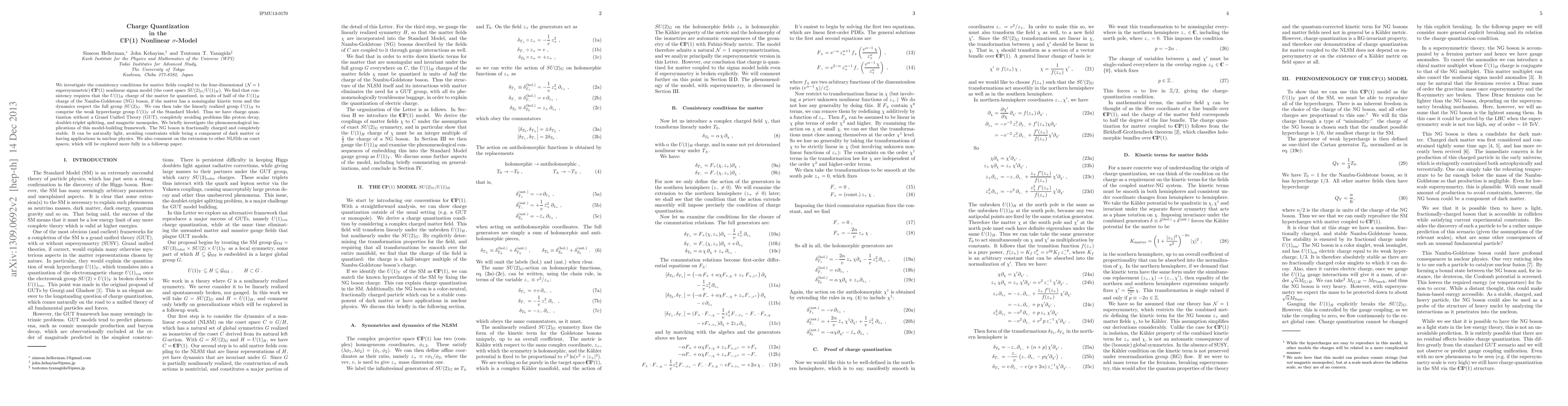 We investigate the consistency conditions for matter fields coupled to the four-dimensional (${\cal N} = 1$ supersymmetric) $\mathbb{CP}(1)$ nonlinear sigma model (the coset space $SU(2)_G/U(1)_H$). We find that consistency requires that the $U(1)_H$ charge of the matter be quantized, in units of half of the $U(1)_H$ charge of the Nambu-Goldstone (NG) boson, if the matter has a nonsingular kinetic term and the dynamics respect the full group $SU(2)_G$. We can then take the linearly realized group $U(1)_H$ to comprise the weak hypercharge group $U(1)_Y$ of the Standard Model. Thus we have charge quantization without a Grand Unified Theory (GUT), completely avoiding problems like proton decay, doublet-triplet splitting, and magnetic monopoles. We briefly investigate the phenomenological implications of this model-building framework. The NG boson is fractionally charged and completely stable. It can be naturally light, avoiding constraints while being a component of dark matter or having applications in nuclear physics. We also comment on the extension to other NLSMs on coset spaces, which will be explored more fully in a followup paper.