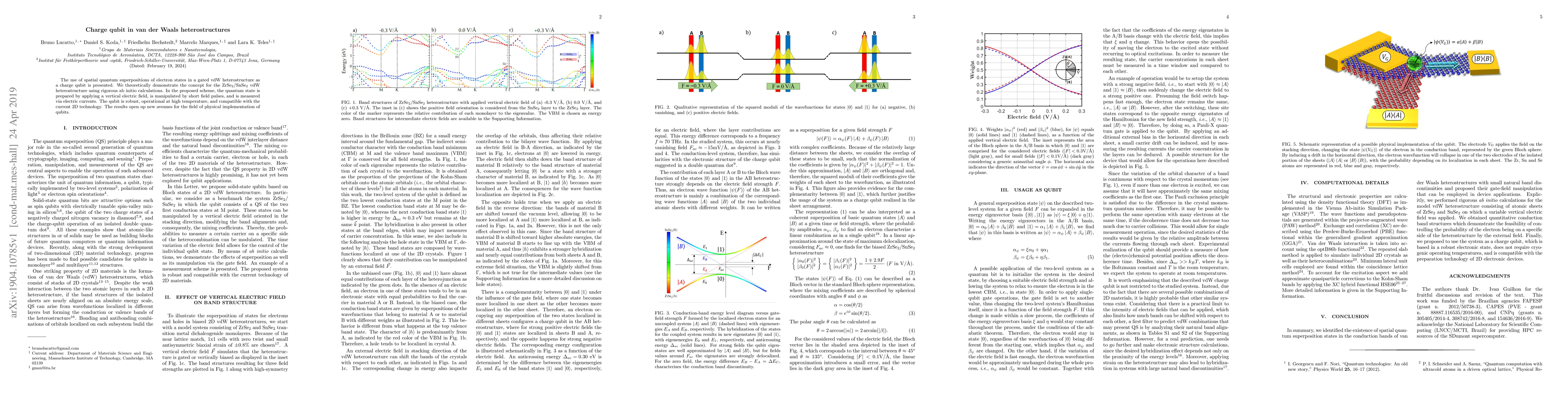 The use of spatial quantum superpositions of electron states in a gated vdW heterostructure as a charge qubit is presented. We theoretically demonstrate the concept for the ZrSe$_2$/SnSe$_2$ vdW heterostructure using rigorous ab initio calculations. In the proposed scheme, the quantum state is prepared by applying a vertical electric field, is manipulated by short field pulses, and is measured via electric currents. The qubit is robust, operational at high temperature, and compatible with the current 2D technology. The results open up new avenues for the field of physical implementation of qubits.