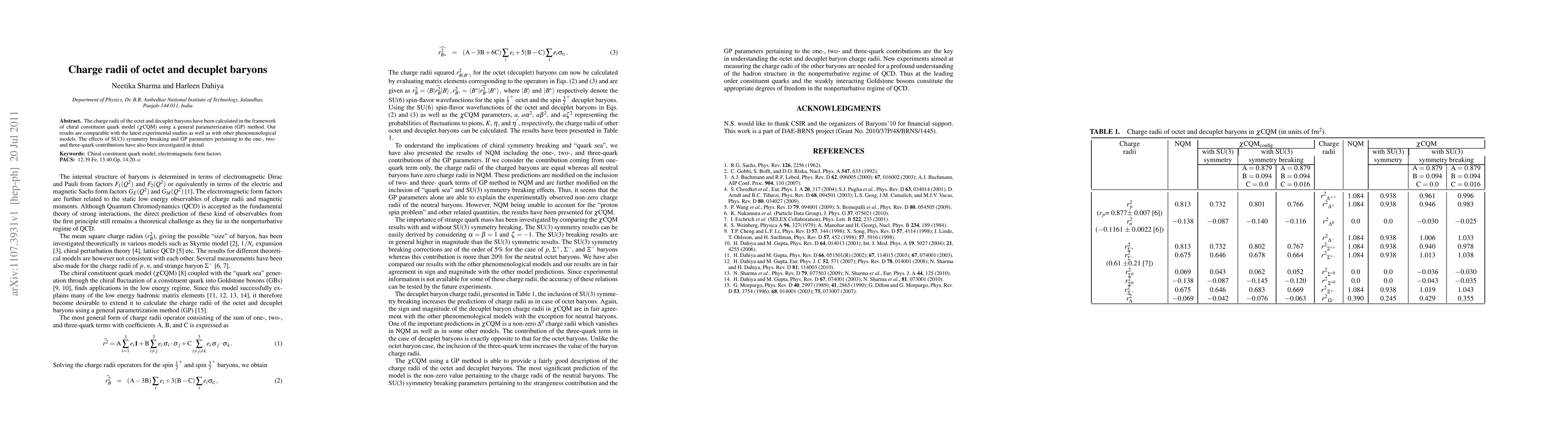This paper calculates the charge radii of octet and decuplet baryons using the chiral constituent quark model and a general parameterization method, showing results consistent with experimental data and other models, while also analyzing the impact of SU(3) symmetry breaking and various quark contributions.