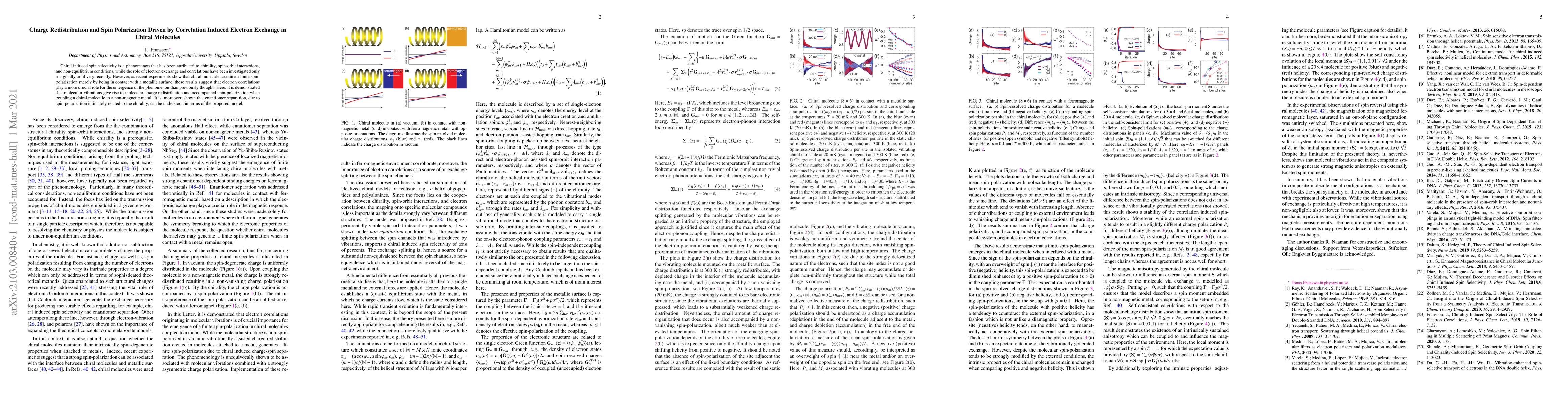 Chiral induced spin selectivity is a phenomenon that has been attributed to chirality, spin-orbit interactions, and non-equilibrium conditions, while the role of electron exchange and correlations have been investigated only marginally until very recently. However, as recent experiments show that chiral molecules acquire a finite spin-polarization merely by being in contact with a metallic surface, these results suggest that electron correlations play a more crucial role for the emergence of the phenomenon than previously thought. Here, it is demonstrated that molecular vibrations give rise to molecular charge redistribution and accompanied spin-polarization when coupling a chiral molecule to a non-magnetic metal. It is, moreover, shown that enantiomer separation, due to spin-polarization intimately related to the chirality, can be understood in terms of the proposed model.
