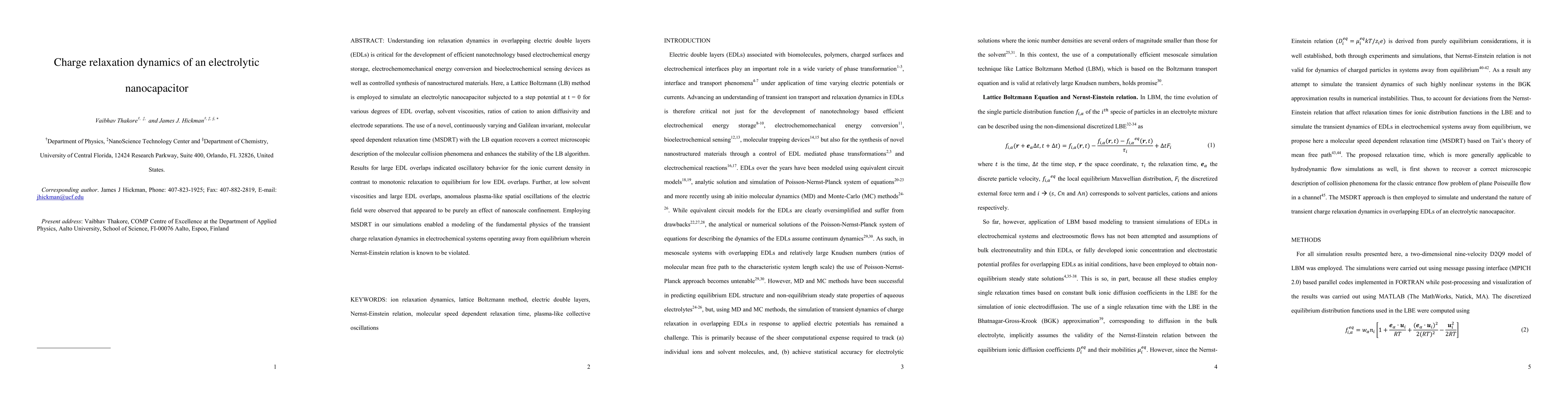 Understanding ion relaxation dynamics in overlapping electric double layers (EDLs) is critical for the development of efficient nanotechnology based electrochemical energy storage, electrochemomechanical energy conversion and bioelectrochemical sensing devices as well as controlled synthesis of nanostructured materials. Here, a Lattice Boltzmann (LB) method is employed to simulate an electrolytic nanocapacitor subjected to a step potential at t = 0 for various degrees of EDL overlap, solvent viscosities, ratios of cation to anion diffusivity and electrode separations. The use of a novel, continuously varying and Galilean invariant, molecular speed dependent relaxation time (MSDRT) with the LB equation recovers a correct microscopic description of the molecular collision phenomena and enhances the stability of the LB algorithm. Results for large EDL overlaps indicated oscillatory behavior for the ionic current density in contrast to monotonic relaxation to equilibrium for low EDL overlaps. Further, at low solvent viscosities and large EDL overlaps, anomalous plasma-like spatial oscillations of the electric field were observed that appeared to be purely an effect of nanoscale confinement. Employing MSDRT in our simulations enabled a modeling of the fundamental physics of the transient charge relaxation dynamics in electrochemical systems operating away from equilibrium wherein Nernst-Einstein relation is known to be violated.