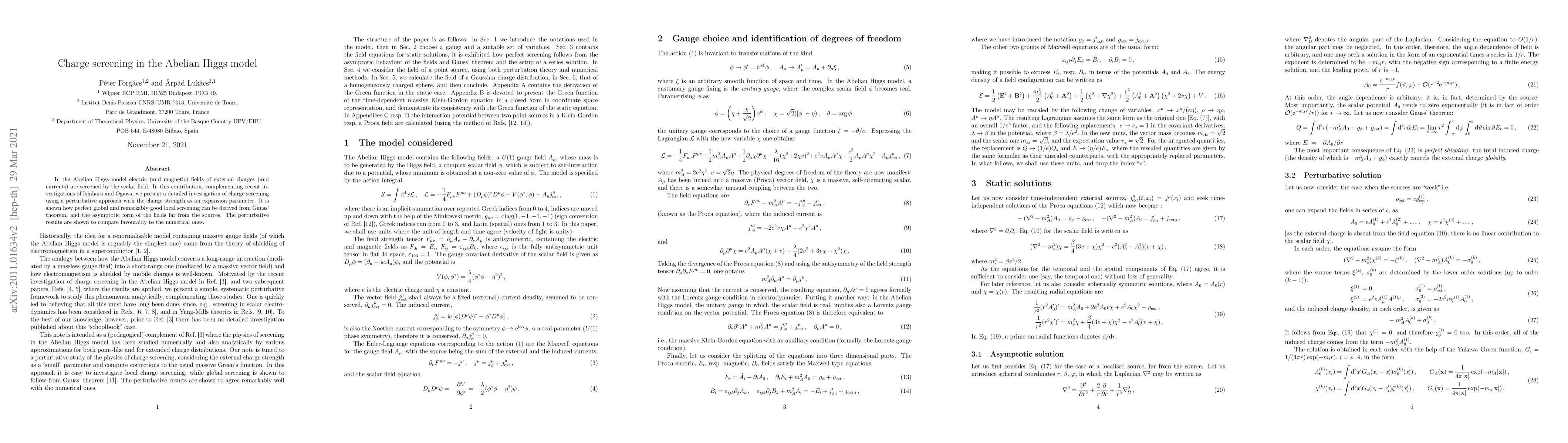 This paper investigates charge screening in the Abelian Higgs model using a perturbative approach, demonstrating that electric fields are effectively screened by the scalar field. The study shows strong global and local screening effects, corroborated by favorable comparisons between perturbative and numerical results.