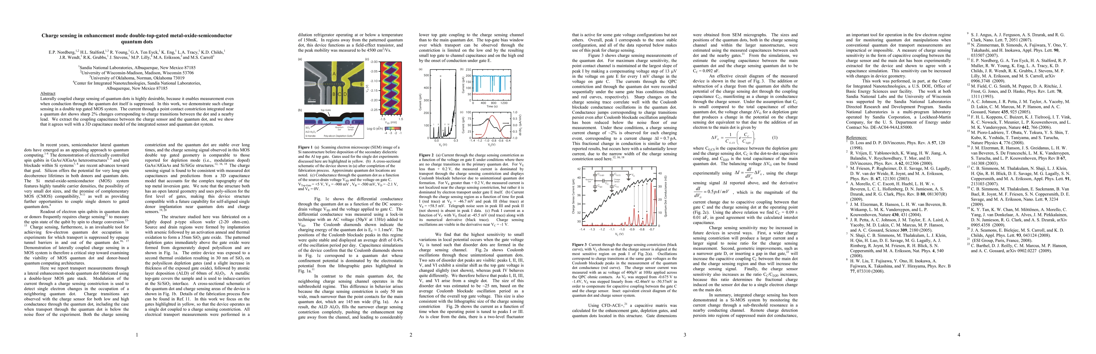 This study demonstrates charge sensing in a double top-gated MOS quantum dot system, showing sharp current changes of 2% during charge transitions, and validates the coupling capacitance using a 3D capacitance model.