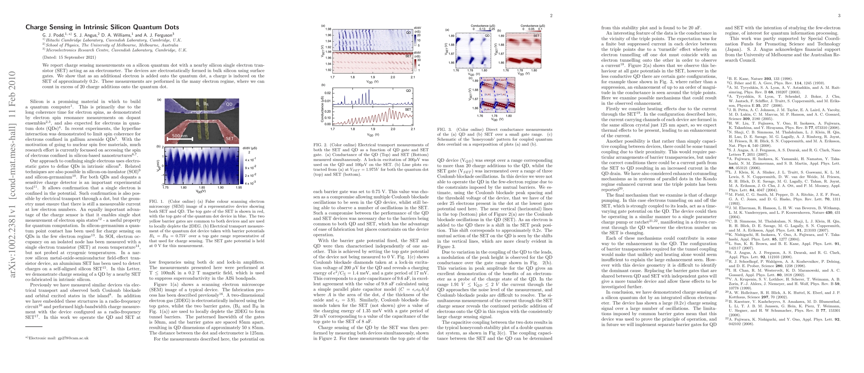 This paper reports on charge sensing in intrinsic silicon quantum dots using a nearby silicon single electron transistor as an electrometer, demonstrating that each additional electron added to the quantum dot induces a charge of approximately 0.2e on the electrometer, with measurements conducted in the many electron regime.