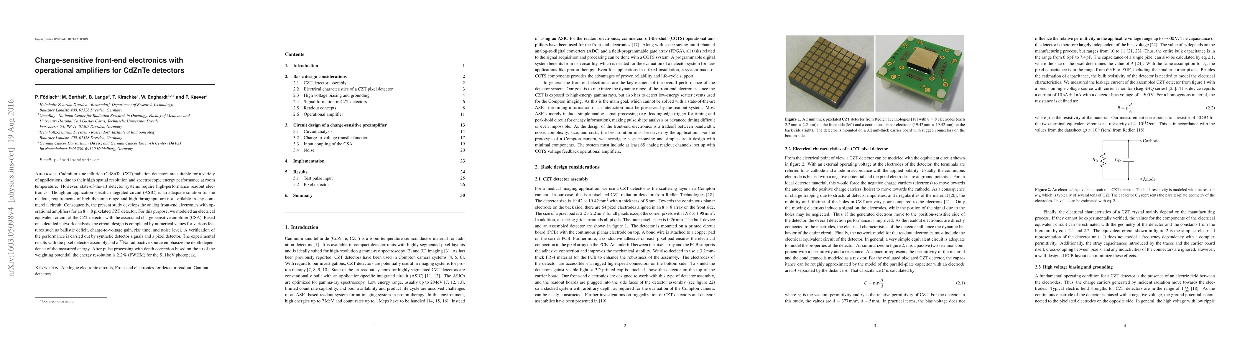 Cadmium zinc telluride (CdZnTe, CZT) radiation detectors are suitable for a variety of applications, due to their high spatial resolution and spectroscopic energy performance at room temperature. However, state-of-the-art detector systems require high-performance readout electronics. Though an application-specific integrated circuit (ASIC) is an adequate solution for the readout, requirements of high dynamic range and high throughput are not available in any commercial circuit. Consequently, the present study develops the analog front-end electronics with operational amplifiers for an 8x8 pixelated CZT detector. For this purpose, we modeled an electrical equivalent circuit of the CZT detector with the associated charge-sensitive amplifier (CSA). Based on a detailed network analysis, the circuit design is completed by numerical values for various features such as ballistic deficit, charge-to-voltage gain, rise time, and noise level. A verification of the performance is carried out by synthetic detector signals and a pixel detector. The experimental results with the pixel detector assembly and a 22Na radioactive source emphasize the depth dependence of the measured energy. After pulse processing with depth correction based on the fit of the weighting potential, the energy resolution is 2.2% (FWHM) for the 511 keV photopeak.