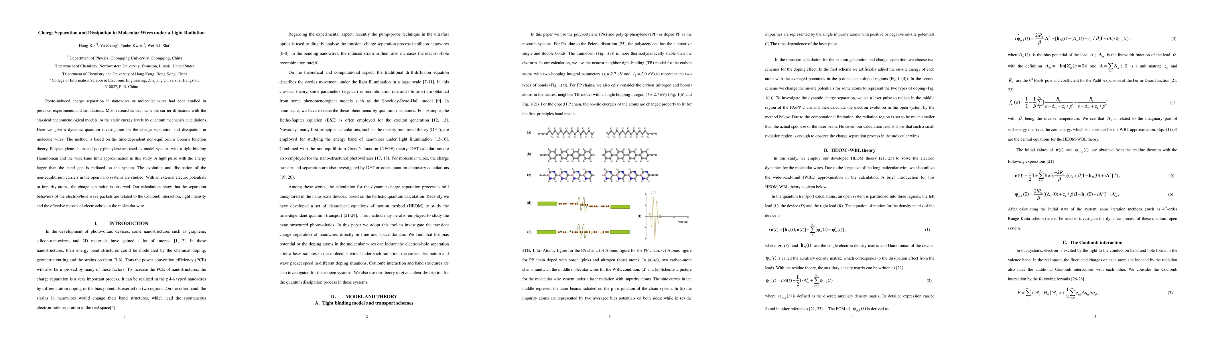 This study employs time-dependent non-equilibrium Green's function theory to investigate dynamic charge separation and dissipation in polyacetylene and poly-phenylene molecular wires under light radiation. Results reveal that electron/hole wave packet separation is influenced by Coulomb interaction, light intensity, and effective masses, with external electric potentials or impurities enhancing charge separation.