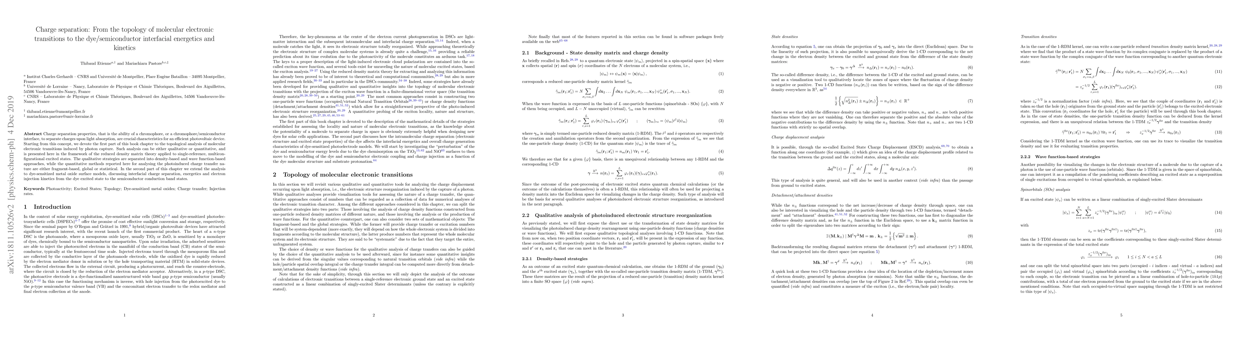 Charge separation properties, that is the ability of a chromophore, or a chromophore/semiconductor interface, to separate charges upon light absorption, are crucial characteristics for an efficient photovoltaic device. Starting from this concept, we devote the first part of this book chapter to the topological analysis of molecular electronic transitions induced by photon capture. Such analysis can be either qualitative or quantitative, and is presented here in the framework of the reduced density matrix theory applied to single-reference, multiconfigurational excited states. The qualitative strategies are separated into density-based and wave function-based approaches, while the quantitative methods reported here for analysing the photoinduced charge transfer nature are either fragment-based, global or statistical. In the second part of this chapter we extend the analysis to dye-sensitized metal oxide surface models, discussing interfacial charge separation, energetics and electron injection kinetics from the dye excited state to the semiconductor conduction band states.