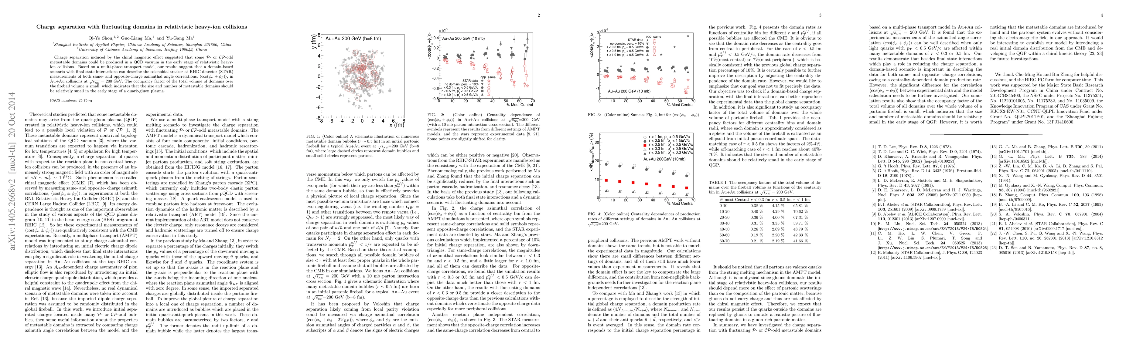 This study explores charge separation via fluctuating domains in relativistic heavy-ion collisions, suggesting that ${\cal P}$- or ${\cal CP}$-odd metastable domains may form in the QCD vacuum. The multi-phase transport model aligns with STAR detector measurements of charge correlations in Au+Au collisions, indicating small domain occupancy in the quark-gluon plasma.