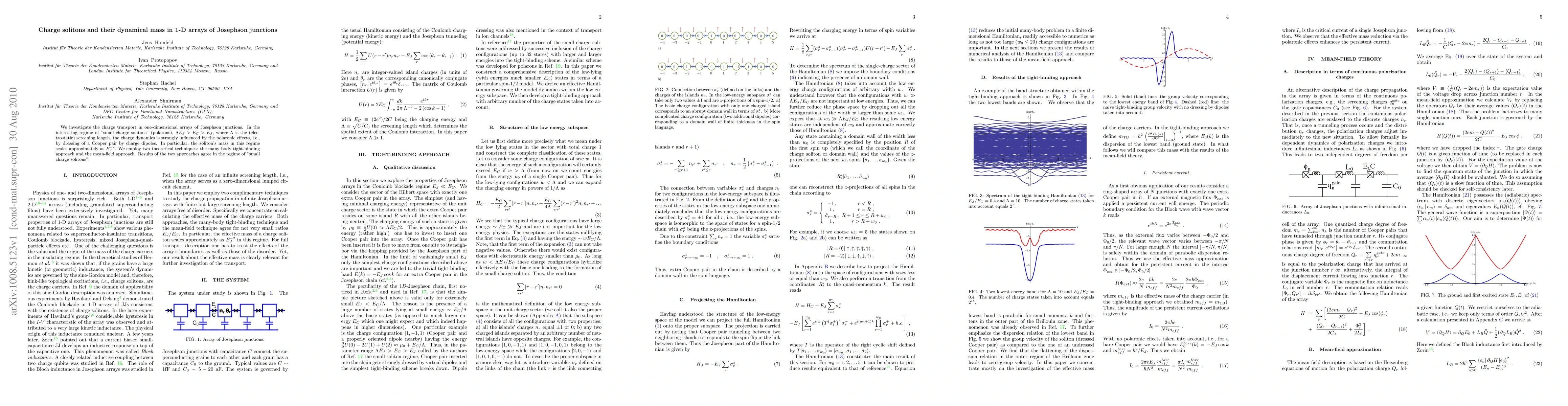 This paper investigates charge transport in 1-D arrays of Josephson junctions, focusing on "small charge solitons" (polarons) where their dynamics are significantly influenced by polaronic effects. The study finds that the soliton's mass scales inversely with the square of the Josephson energy, corroborated by both many-body tight-binding and mean-field approaches.