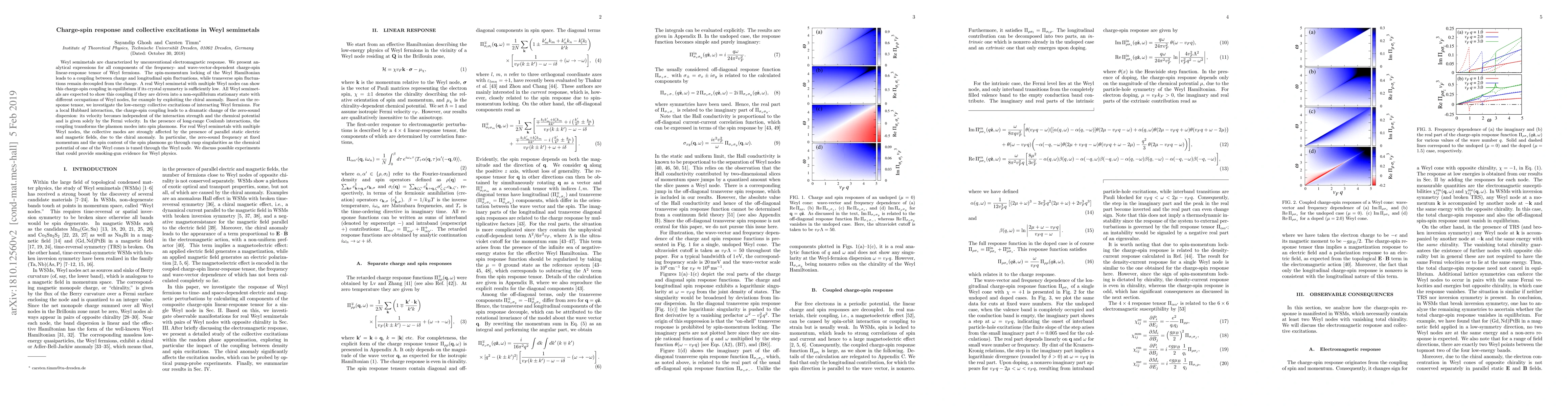 Weyl semimetals are characterized by unconventional electromagnetic response. We present analytical expressions for all components of the frequency- and wave-vector-dependent charge-spin linear-response tensor of Weyl fermions. The spin-momentum locking of the Weyl Hamiltonian leads to a coupling between charge and longitudinal spin fluctuations, while transverse spin fluctuations remain decoupled from the charge. A real Weyl semimetal with multiple Weyl nodes can show this charge-spin coupling in equilibrium if its crystal symmetry is sufficiently low. All Weyl semimetals are expected to show this coupling if they are driven into a non-equilibrium stationary state with different occupations of Weyl nodes, for example by exploiting the chiral anomaly. Based on the response tensor, we investigate the low-energy collective excitations of interacting Weyl fermions. For a local Hubbard interaction, the charge-spin coupling leads to a dramatic change of the zero-sound dispersion: its velocity becomes independent of the interaction strength and the chemical potential and is given solely by the Fermi velocity. In the presence of long-range Coulomb interactions, the coupling transforms the plasmon modes into spin plasmons. For real Weyl semimetals with multiple Weyl nodes, the collective modes are strongly affected by the presence of parallel static electric and magnetic fields, due to the chiral anomaly. In particular, the zero-sound frequency at fixed momentum and the spin content of the spin plasmons go through cusp singularities as the chemical potential of one of the Weyl cones is tuned through the Weyl node. We discuss possible experiments that could provide smoking-gun evidence for Weyl physics.